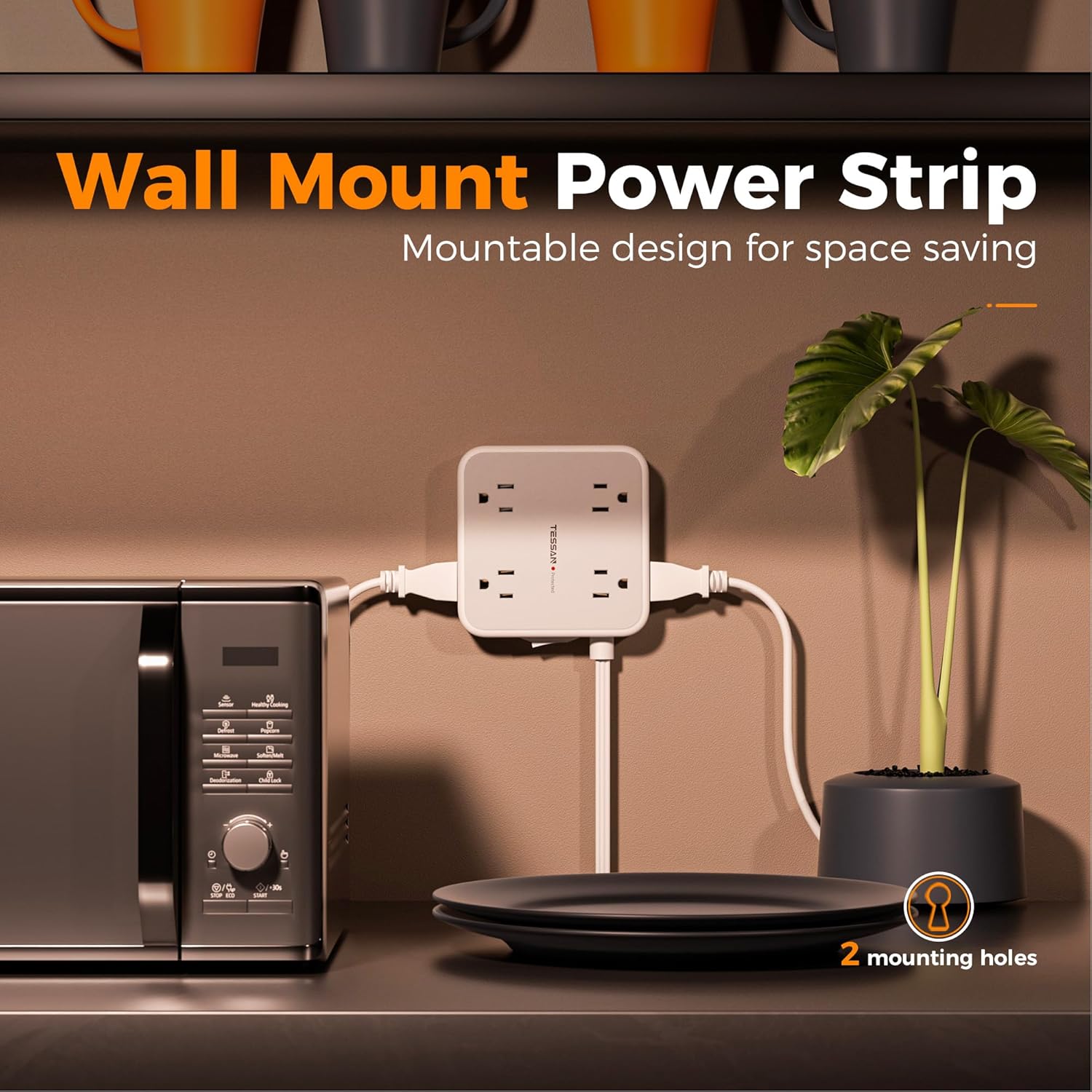 - Mountable Power Strip: The wall mount power strip with 2 mounting holes design can easily mount on the wall, no more worrying about cluttered cables and reducing the desktop space; 4 rubber feet on the bottom effectively prevents slipping and sliding