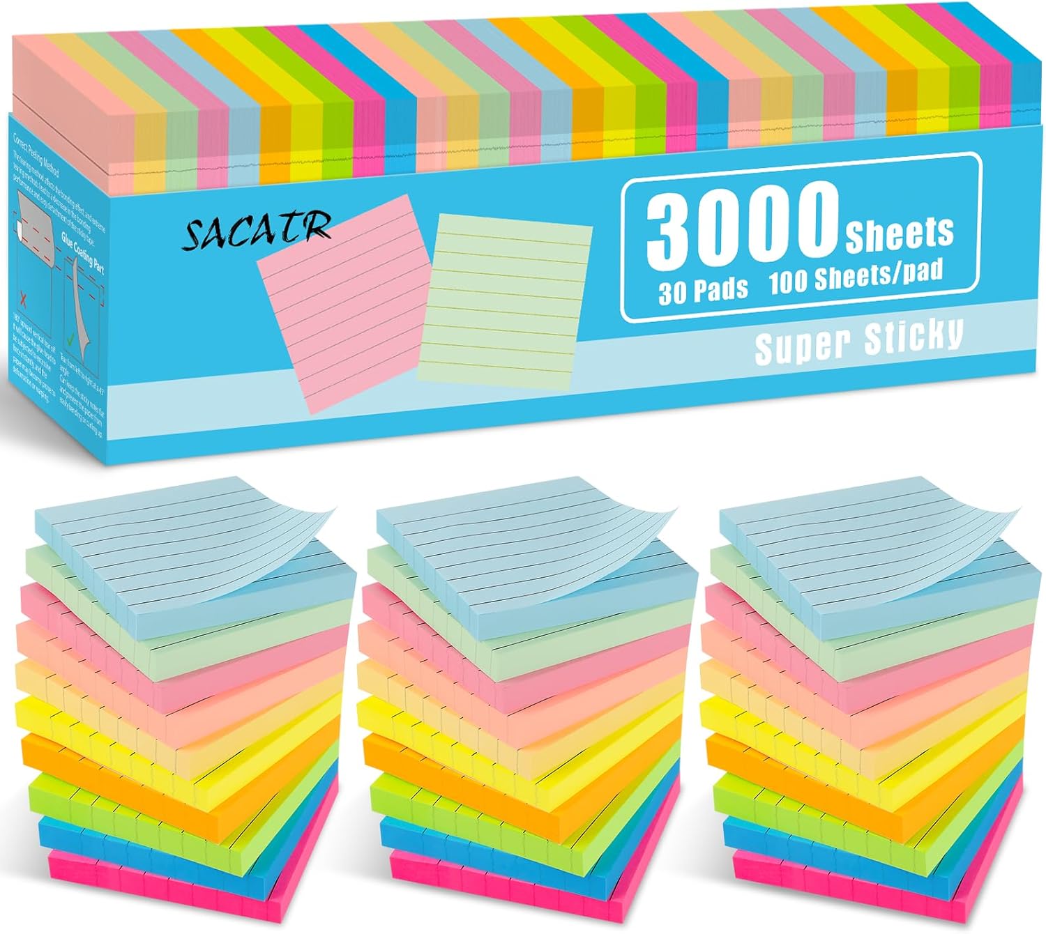 - 【Sticky Notes with Lines】 Lined sticky notes 3x3 inch, 30 pads, 100 Sheets/pad, totaling 3000 sheets.These lined sticky notes are ready to help you stay organized and efficient in every endeavor.