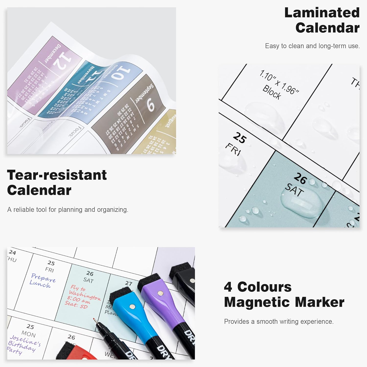 - ⨠Laminated Calendar with Dates: Waterproof wall calendar comes with a mini eraser, four dry-erase markers, 12 push pins, and 10 transparent round stickers. 12 months calendar covers the time range from Jan 2025 to Dec 2025, making it perfect for long-term use.