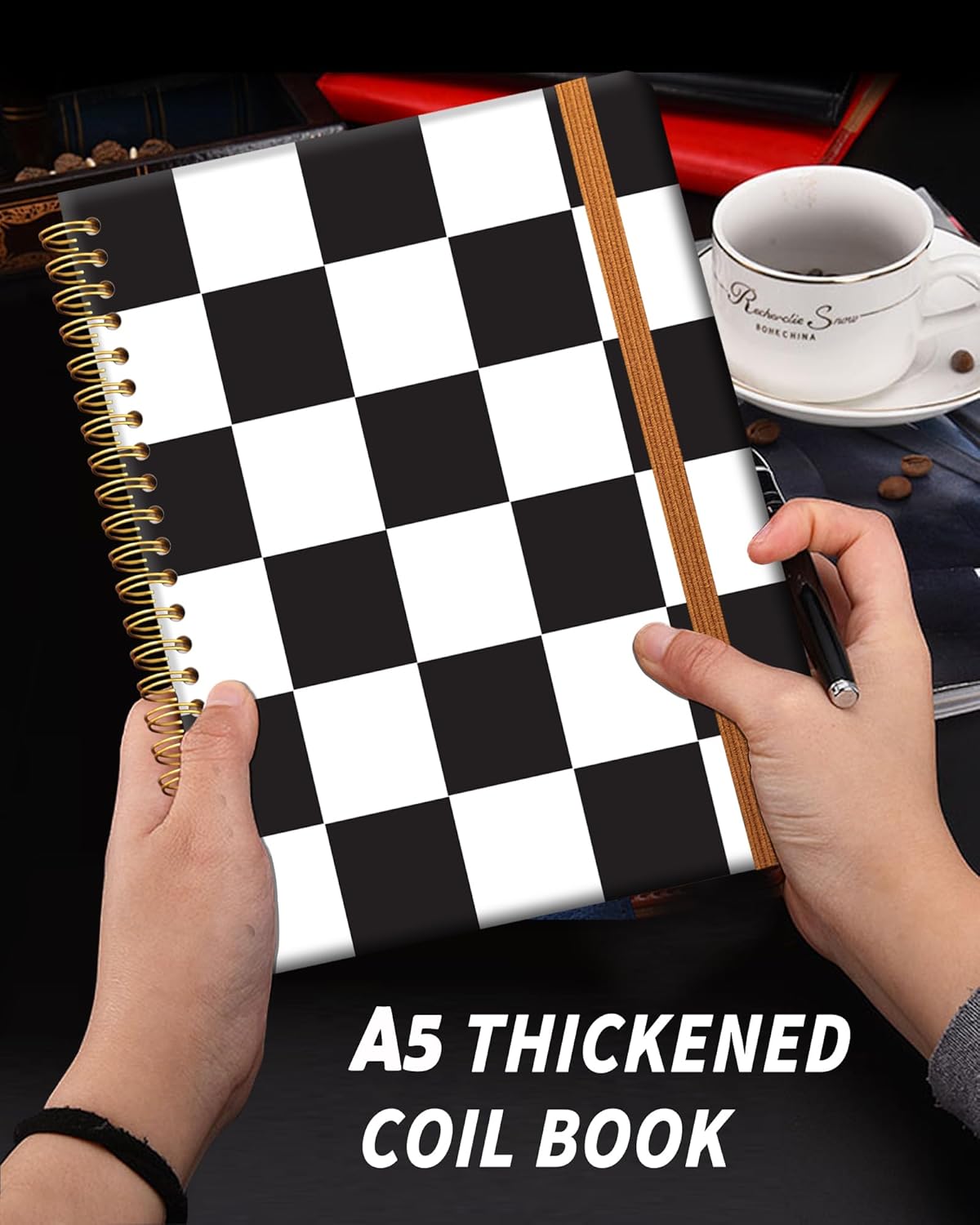 Ruled Spiral Writing Notebook,A5 Hardcover Lined College Journal for Women Lady,Fashion Puppy Watercolor Strong Twin-Wire Binding with Premium Paper,8.4" X 6",Perfect for School,Office,Home Gifts(Black White Checker)