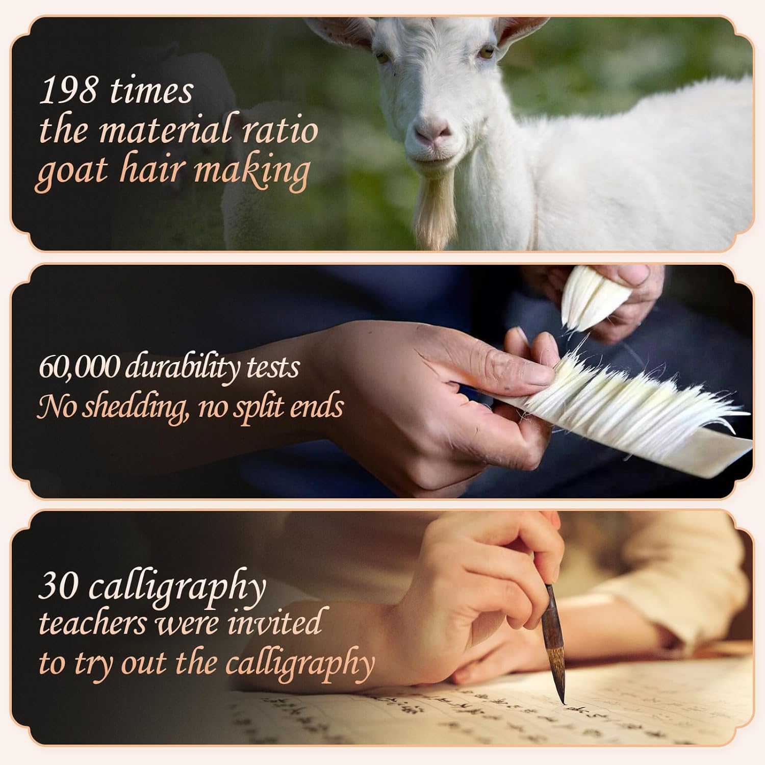 - Versatility and Functionality: Our Chinese calligraphy brush set offers a diverse range of brush types, including 1 piece large goat hair-YangJianHao, 3 pieces wool hair brushes, 2 pieces weasel hair brushes, 3 pieces Jian Hao brushes of goat and wolf hair, 2 pieces rabbit hair brushes, 1 pieces regular script wolf brushes together with 1 piece roll-up brush holder, enough to meet your multiple using needs and convenient for your daily storage.