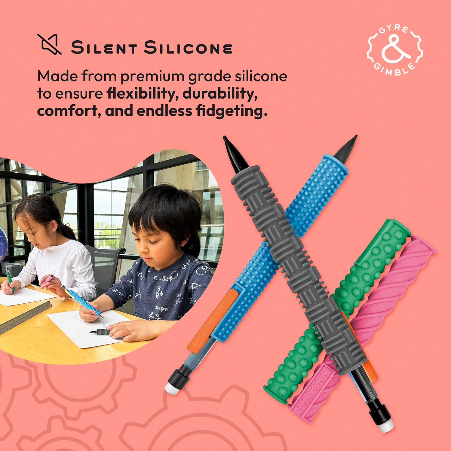 Gyre & Gimble Pencil Gidgets – Textured Silicone Pencil Sleeve for Quiet Fidgeting – Transform Your Mechanical Pencil into a Sensory ADHD Tool for Kids and Adults – 4 Sleeves & 2 Pencils