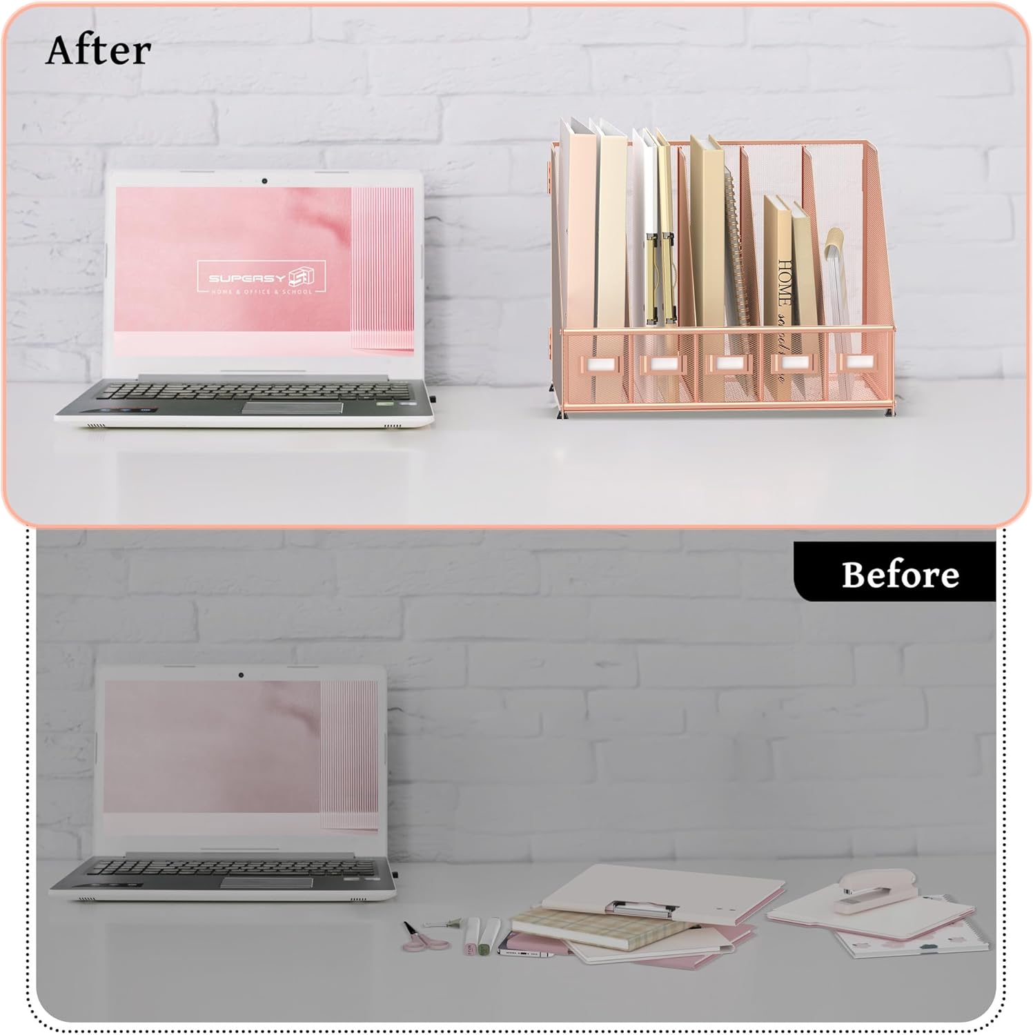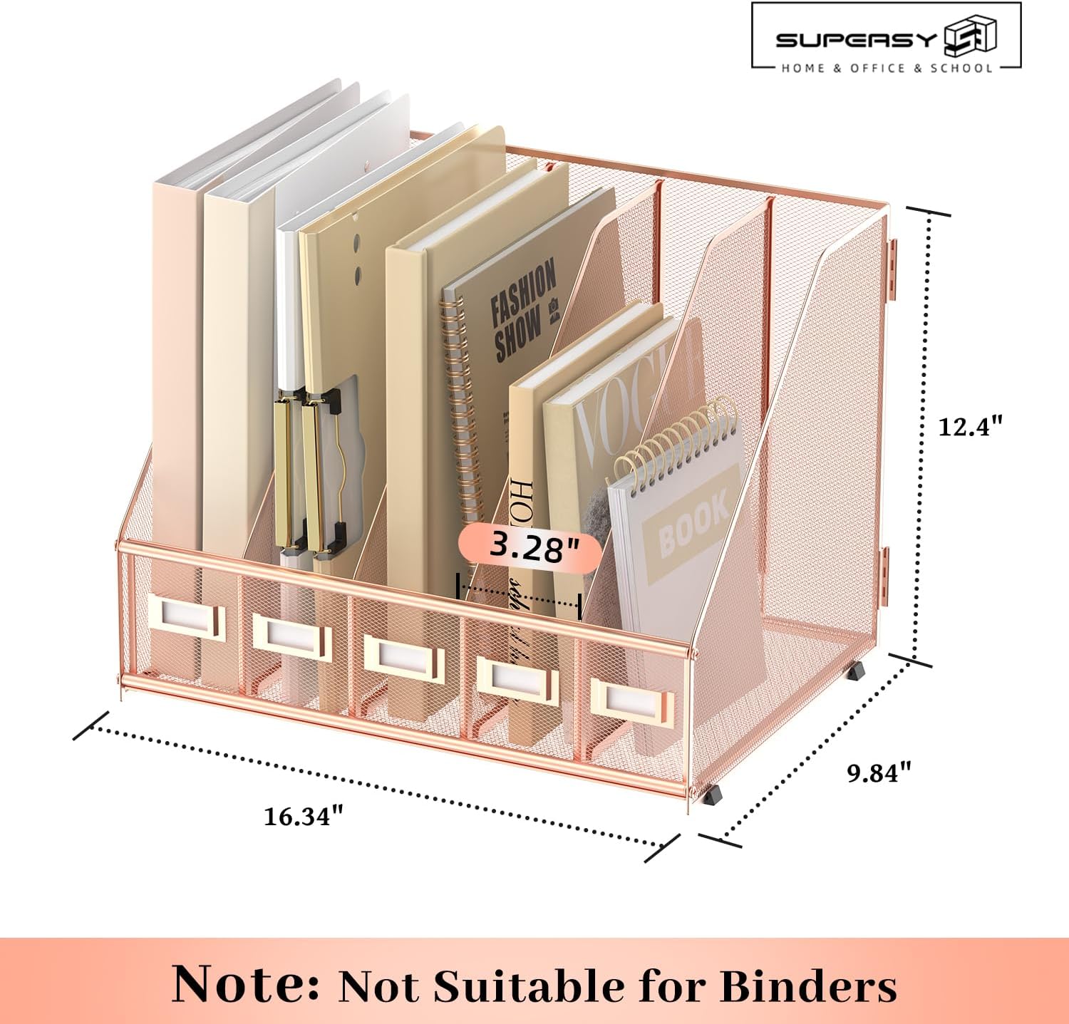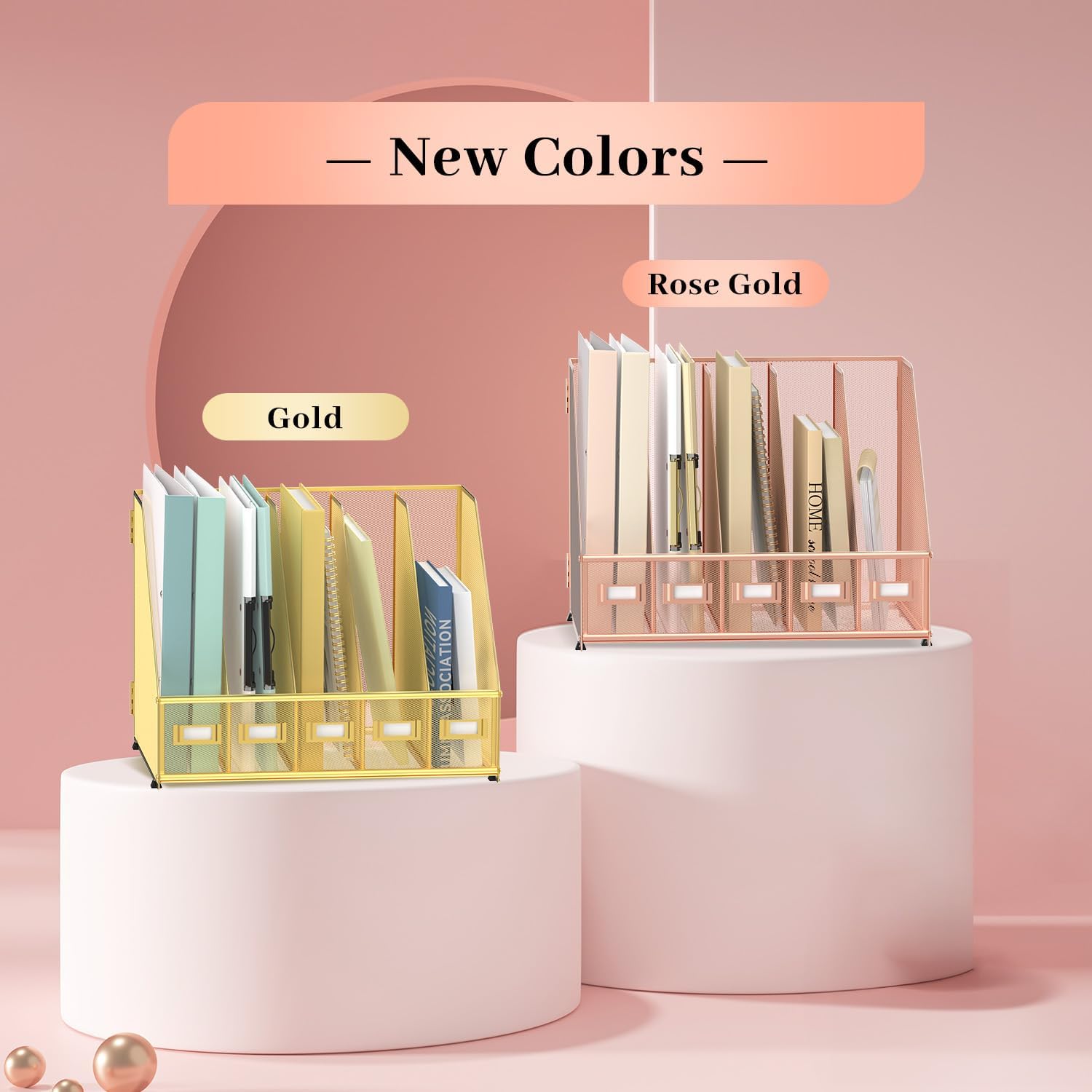 SUPEASY Desk Organizers Metal Desk Magazine File Holder with 5 Vertical Compartments Rack File Organizer for Office Desktop, Home Workspace, Rose Gold