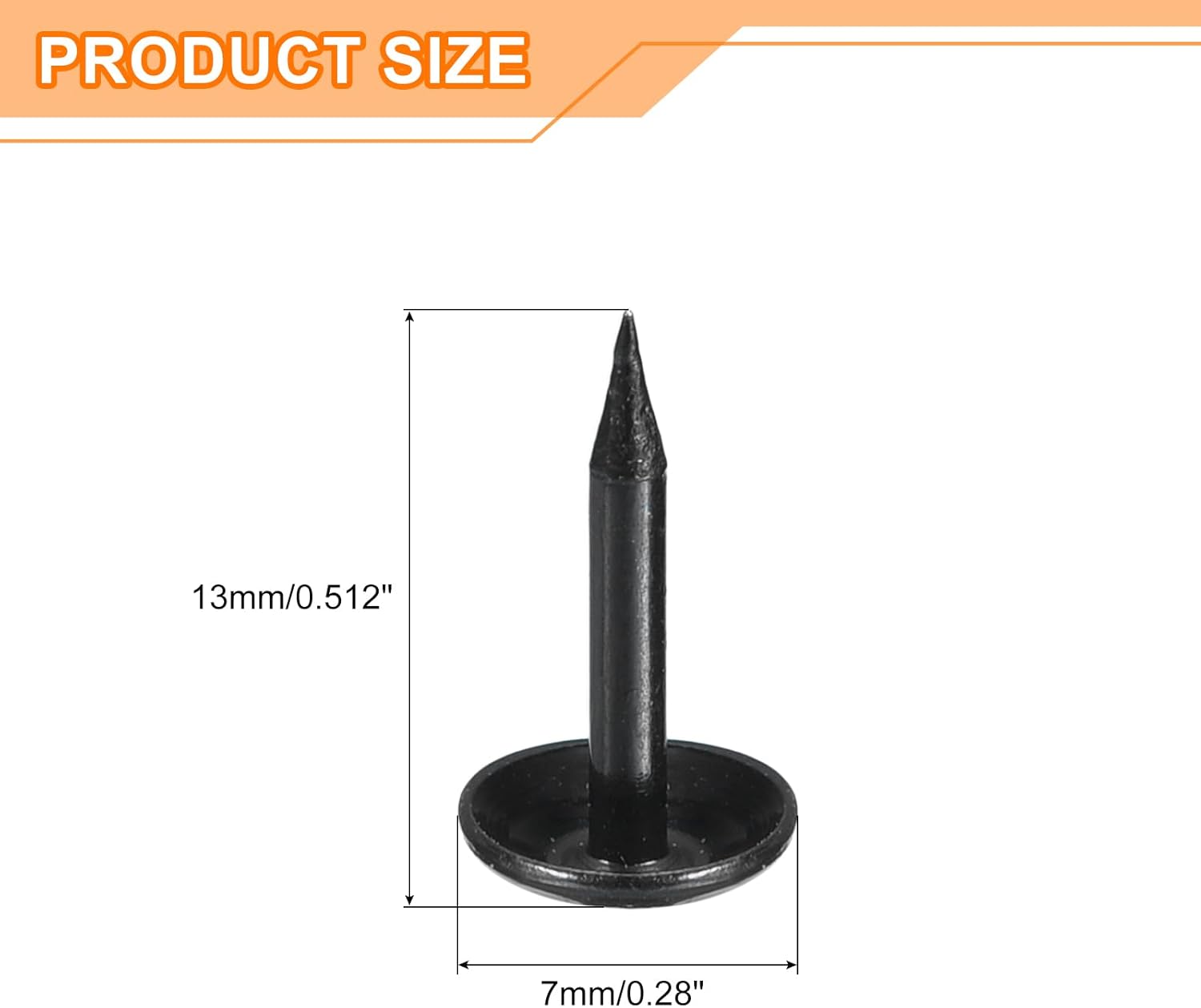 - Specifications: Material: Carbon steel; Color: Black; Diameter of nails head: 7mm/0.28inch; Shank length: 13mm/0.512inch; Package Content: 100Pcs x Upholstery Tacks Nail Pins