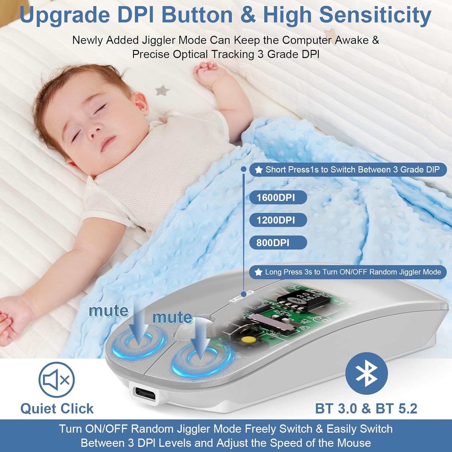 - [Upgrade Newly Added Jiggler Mode & Adjustable DPI]: Upgrade DPI button; Short press 1s to switch between 3 adjustable grade DIP levels optical accurately tracking mode (800DPIă1200DPIă1600DPI). Advanced optical tracking technology with quick click and responsiveness; Long Press 3s to Turn ON/OFF random jiggler mode(randomly move the mouse pointer irregularly). Preventing computer into sleep,keep screen active.suitable for Online video meetingăDownloading filesăGame tasksăOnline classăOnline readingăRemote operation,etc. It keeps the computer active.