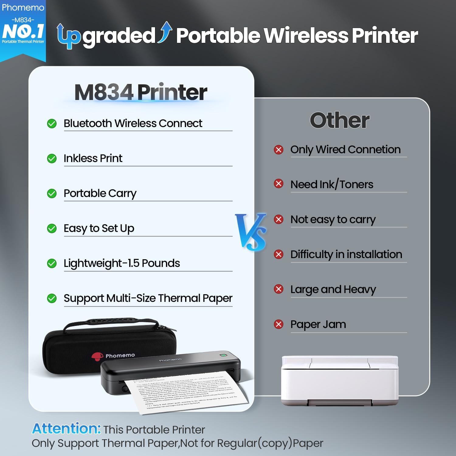 - What's is in Package: 1 M834 Portable Printer,1 Carry Case,1 Roll 8.5" Thermal Paper,1 Roll 4.33" Thermal Paper,1 Roll 3.14" Thermal Paper,1 Roll 2.08" Thermal Paper