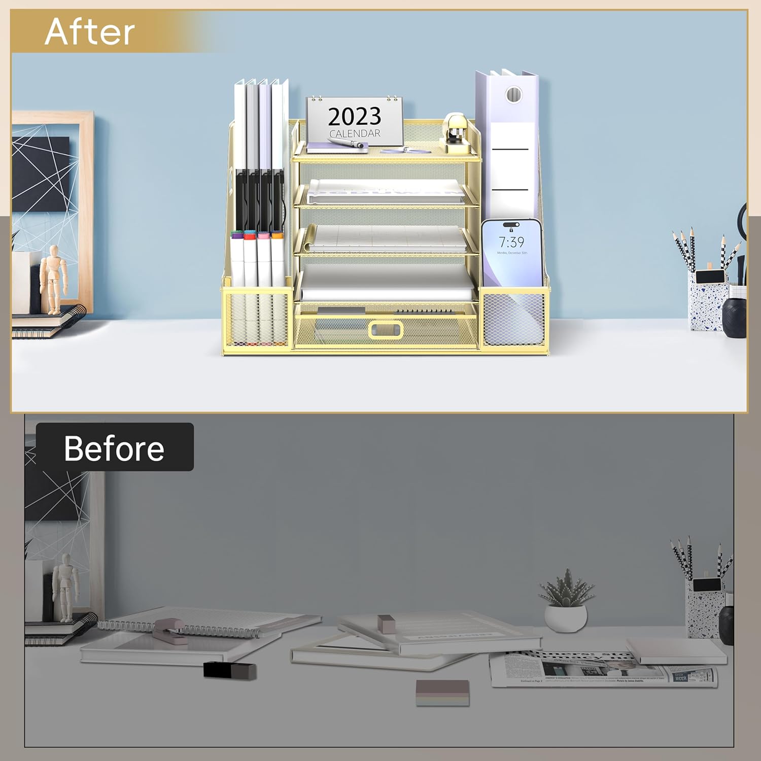 - [Comprehensive Desk Organizer] This desk organizer comes with 4 sliding trays, 2 vertical magazine racks, 2 pen holders and 1 sliding drawer. Equipped with such a complete desk organizer, it is definitely your first choice for office accessories!