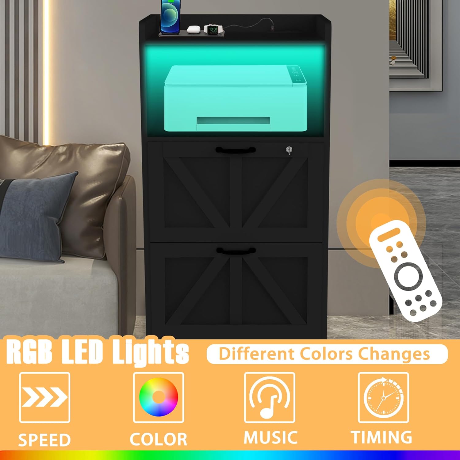 - ăFiling Cabinet with LED LightsăThe vibrant lighting design of the two drawer file cabinet (different color, speed adjustment, music sync, timing function), create a cozy and stylish atmosphere with a remote-controlled LED strip.