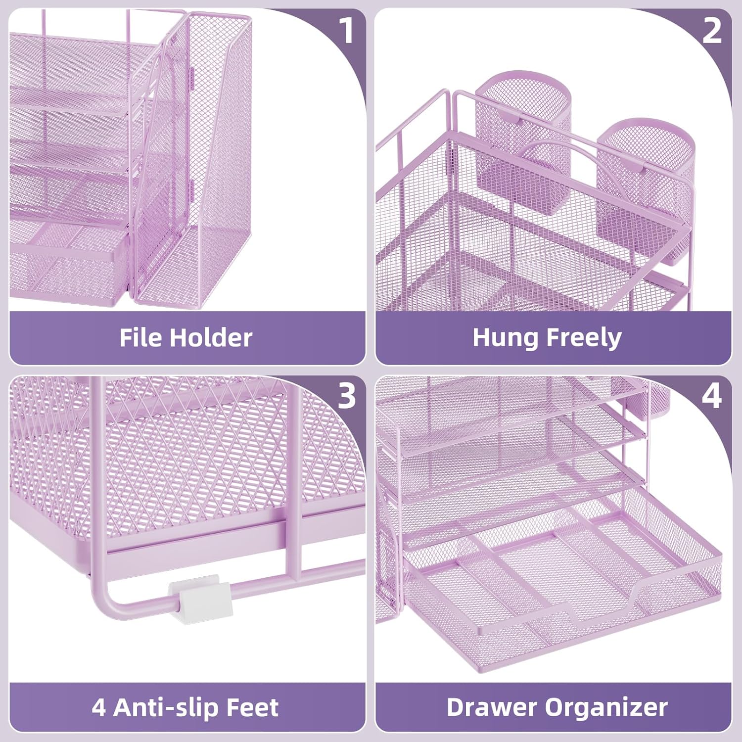Marbrasse Desk Organizer and Accessories,4-Tier Paper Letter Tray Organizer with File Holder, Workspace Desk Organizers Accessories with Drawer and 2 Pen Holder (Purple, 15.4" x 9.1" x 8.3")