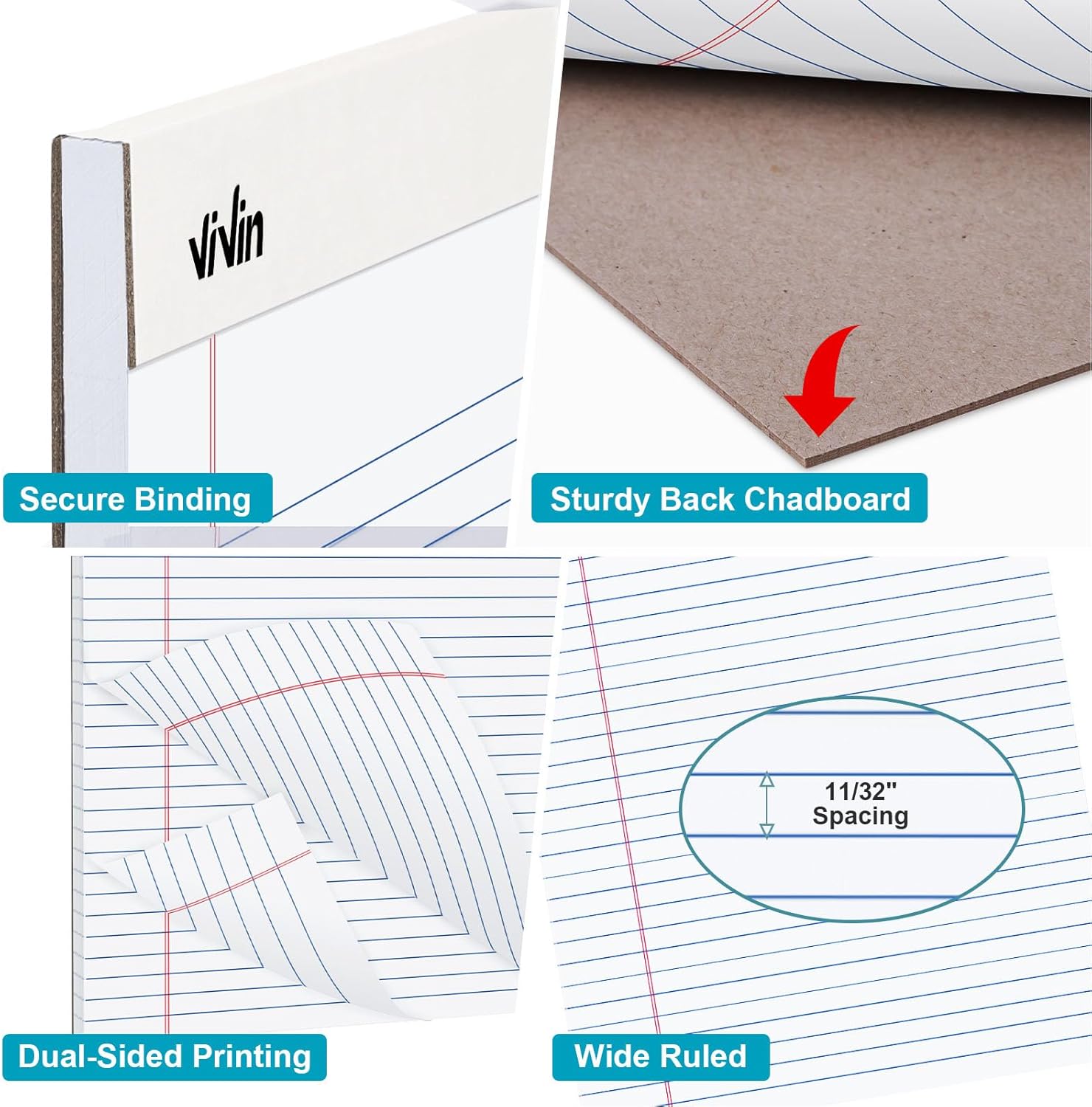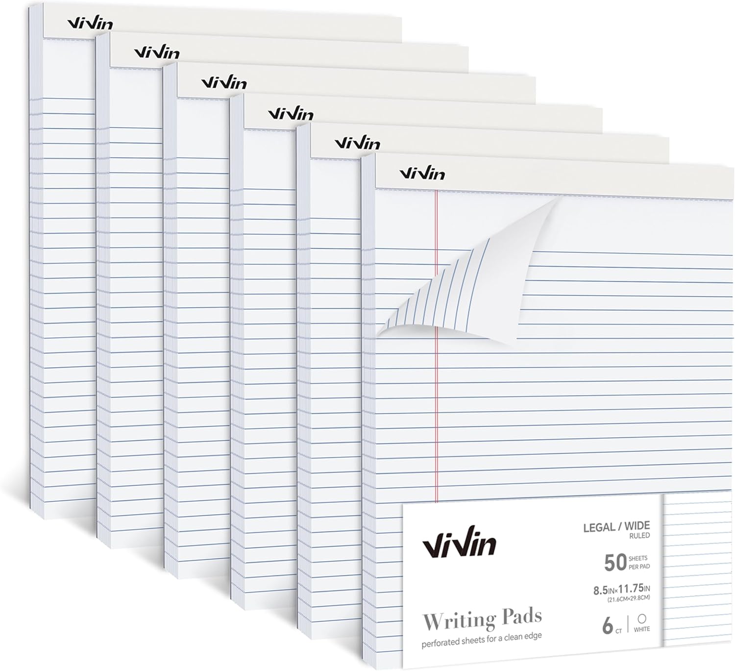 ViVin Legal Pads 8.5 x 11 Inch, Wide Ruled Note Pads, 6 Pack, 50 Sheet/Pad, Perforated Writing Pads, Notepads for Office Home School, 300 Sheets, White Paper