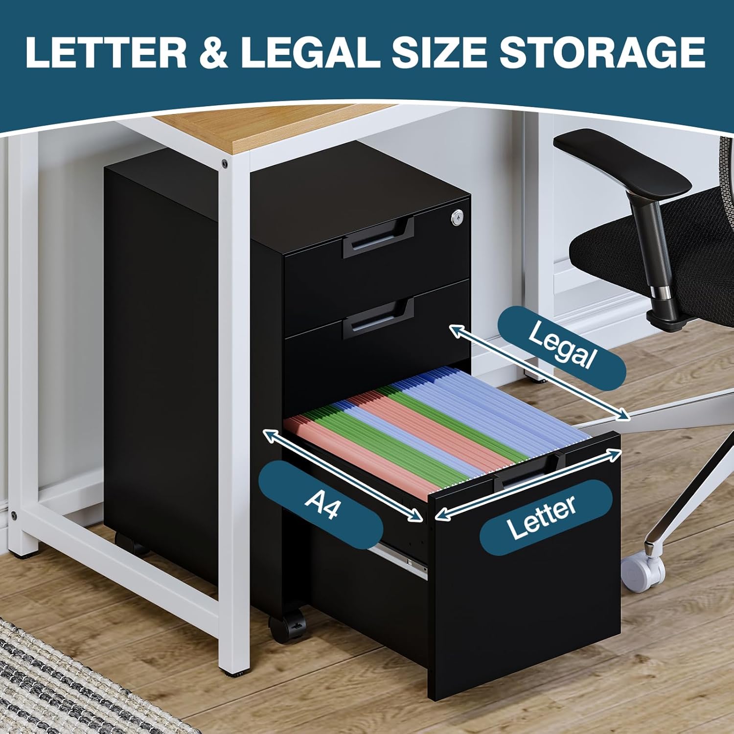 MIIIKO 3 Drawer Filing Cabinet with Lock, Metal Black Vertical File Cabinets for Home Office, Full Assembled File Cabinets Under Desk, Letter/Legal/A4 File Folders Storage
