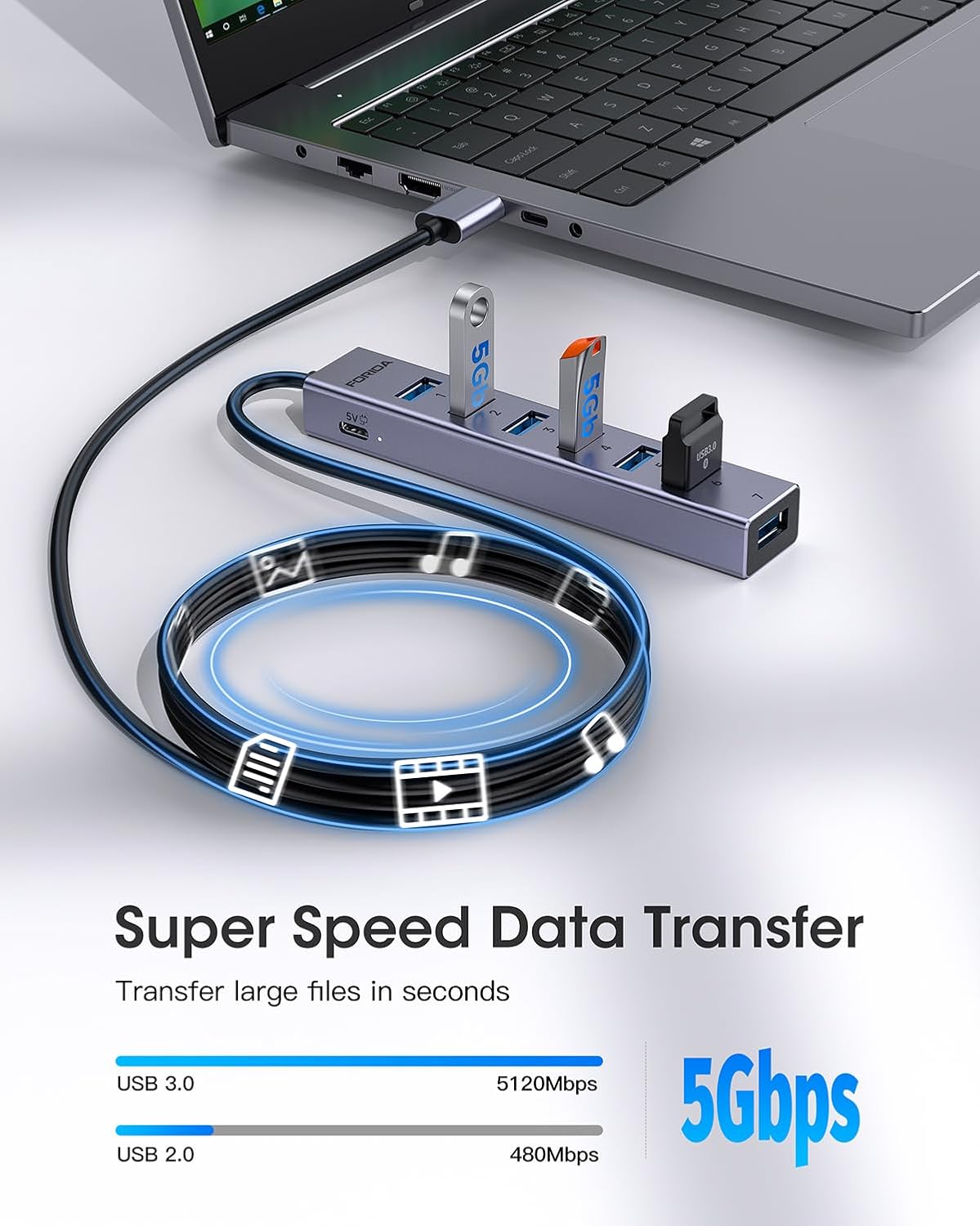 - 【5Gbps Data Transfer Speed】This usb3.0 hub splitter 3.0 syncs data at blazing speeds up to 5Gbps, which is more than 10 times faster than USB 2.0, fast enough to transfer an HD movie in seconds.