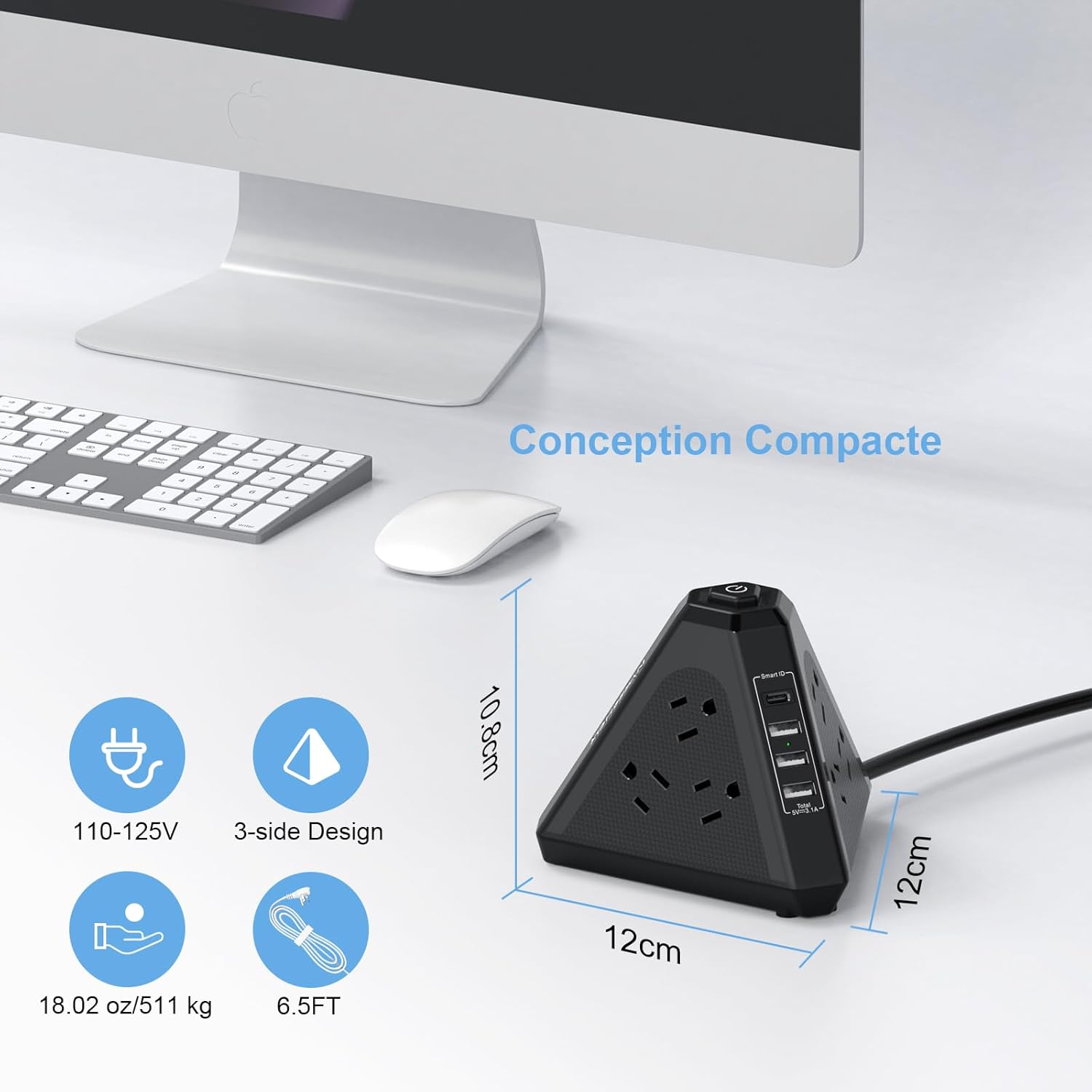 - THREE-SIDED TOWER DESIGN SAVES SPACE: The surge protector power outlet's three-sided compact design takes up little desktop space and keeps cluttered cords neat and tidy; the bottom of the desktop power outlet is equipped with 5 non-slip pads. The triangular design is also more stable and won't fall off easily.