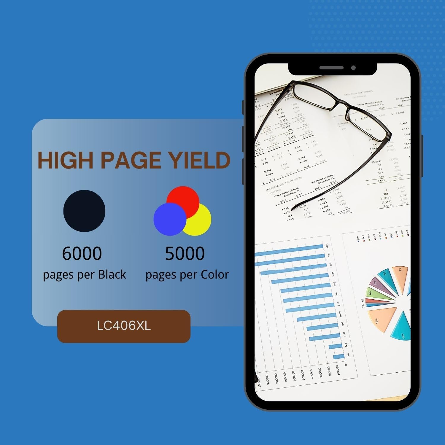 - Page Yield: UP to 6,000 pages per LC406XL LC 406XL Black Ink Cartridge (LC406XLBK) and 5,000 pages for LC406XL LC 406 XL Color Ink Cartridge LC406XLC LC406XLM LC406XLY High Yield Ink Cartridge (A4 Letter, at 5% Coverage)
