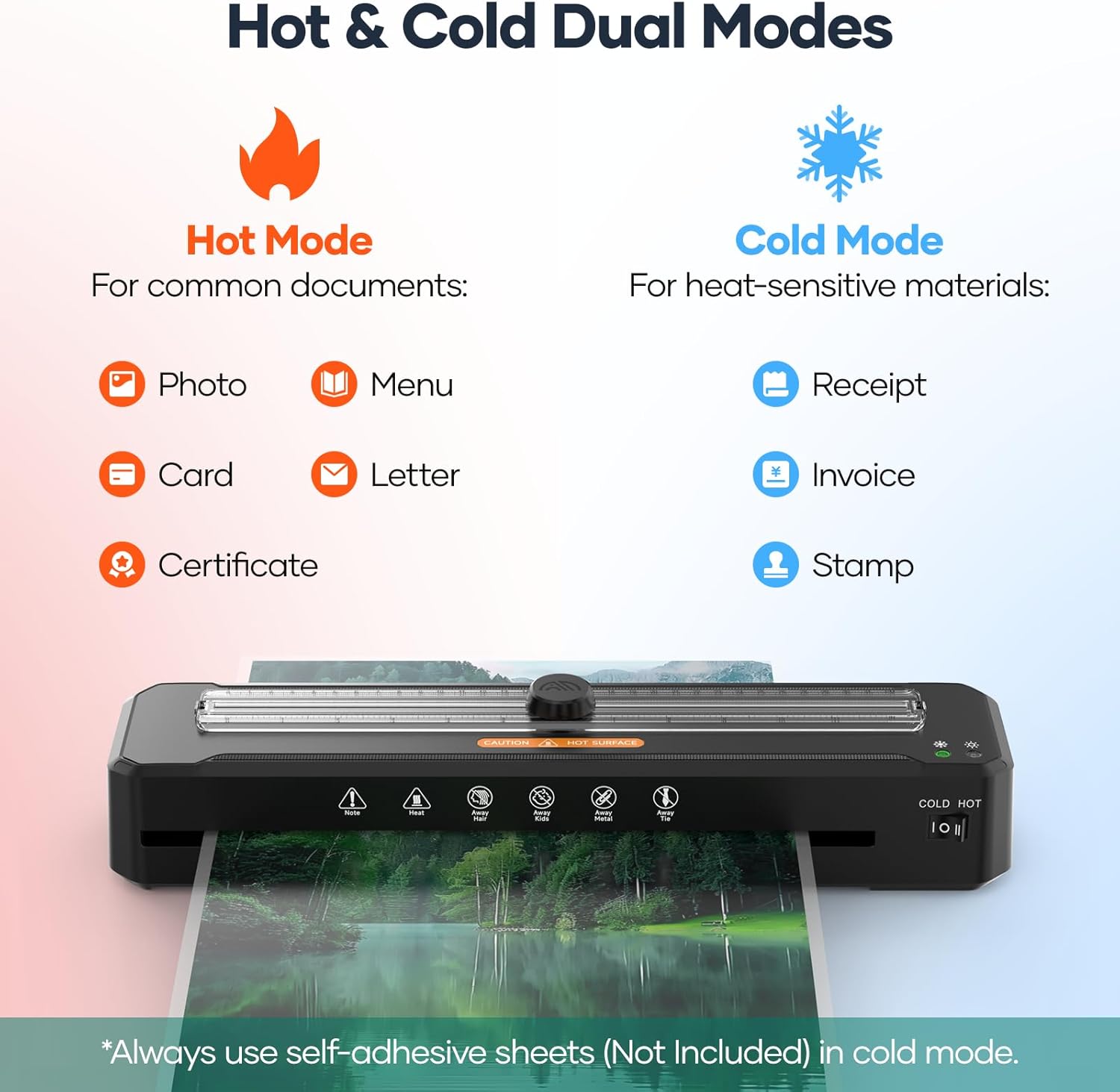 - 【Versatile Laminator】This laminating machine offers both modes. Use hot mode for photos, menus, cards, and certificates. Cold mode for heat-sensitive materials like stamps and invoices. (Please use self-adhesive pouches, not included, for cold lamination).