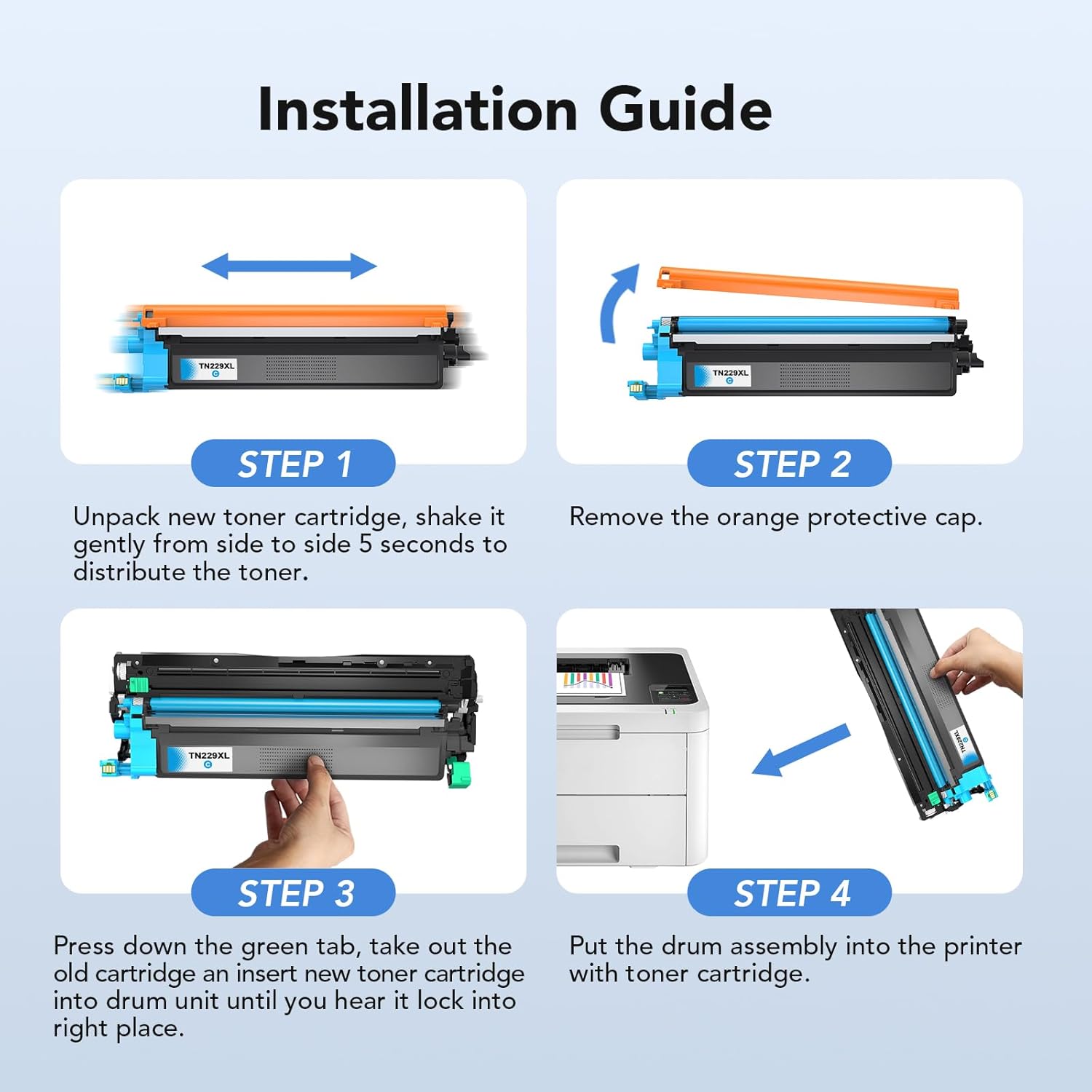 - Printer Compatibility: TN229XL TN229 XL High Yield Toner Cartridge 4 Pack work for Brother MFC-L3780CDW MFC-L3765CDW MFC-L3720CDW MFC-L8395CDW HL-L3220CDW HL-L3280CDW HL-L3295CDW HL-L3300CDW HL-L8245CDW Printers