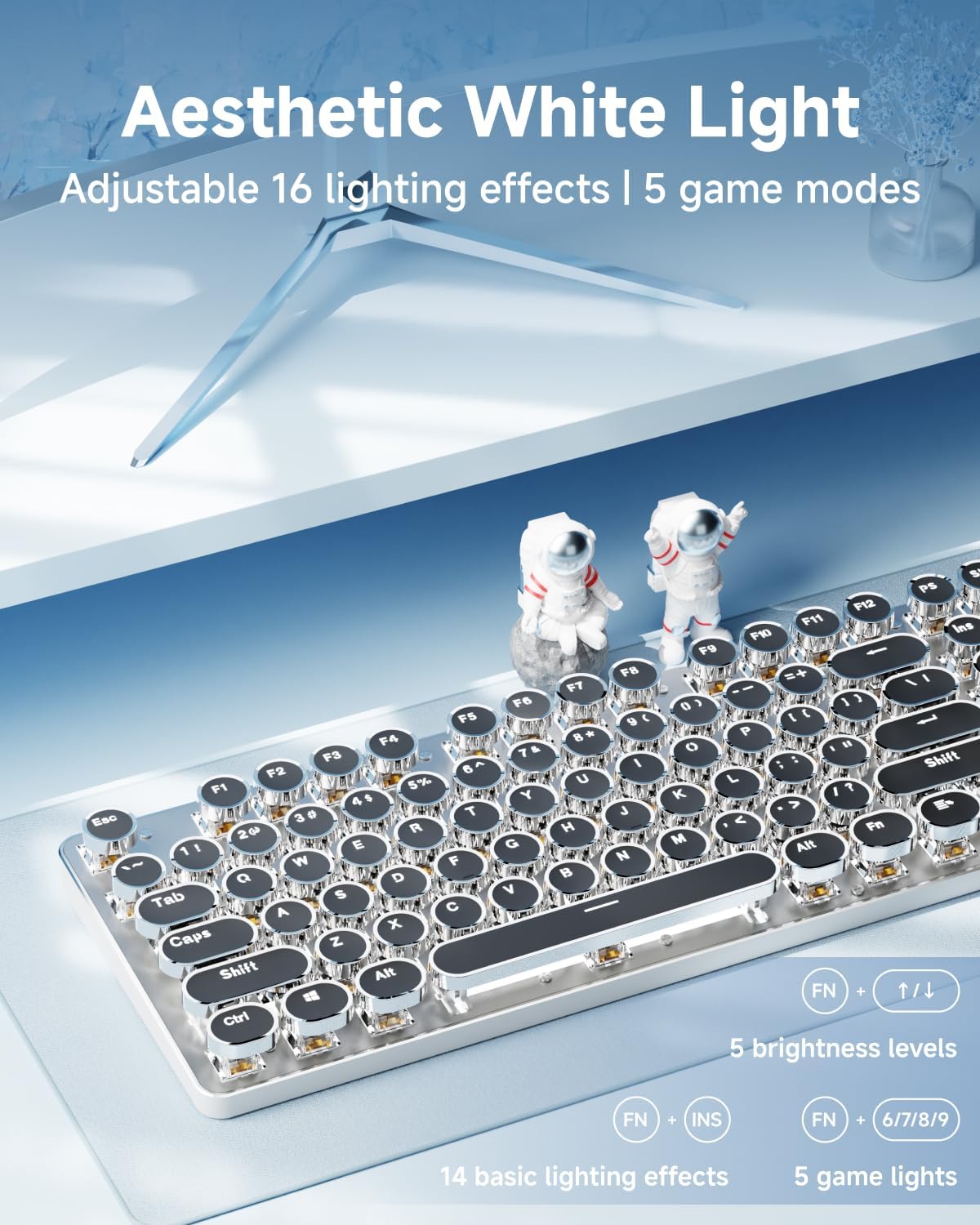 - 104-key Anti-ghosting and 19 Lighting Effects: The clicky keyboard cute wireless adopts 104-key anti-ghosting technology, allows multiple keys to be pressed at the same time without conflict. Office is more efficient and games are smoother. Retro typewriter keyboard can adjust 19 lighting effects, including 14 basic lighting effects and 5 game lighting effects. Also, this cute keyboard usb adopts ergonomic design and is also an excellent typing tool for office work.