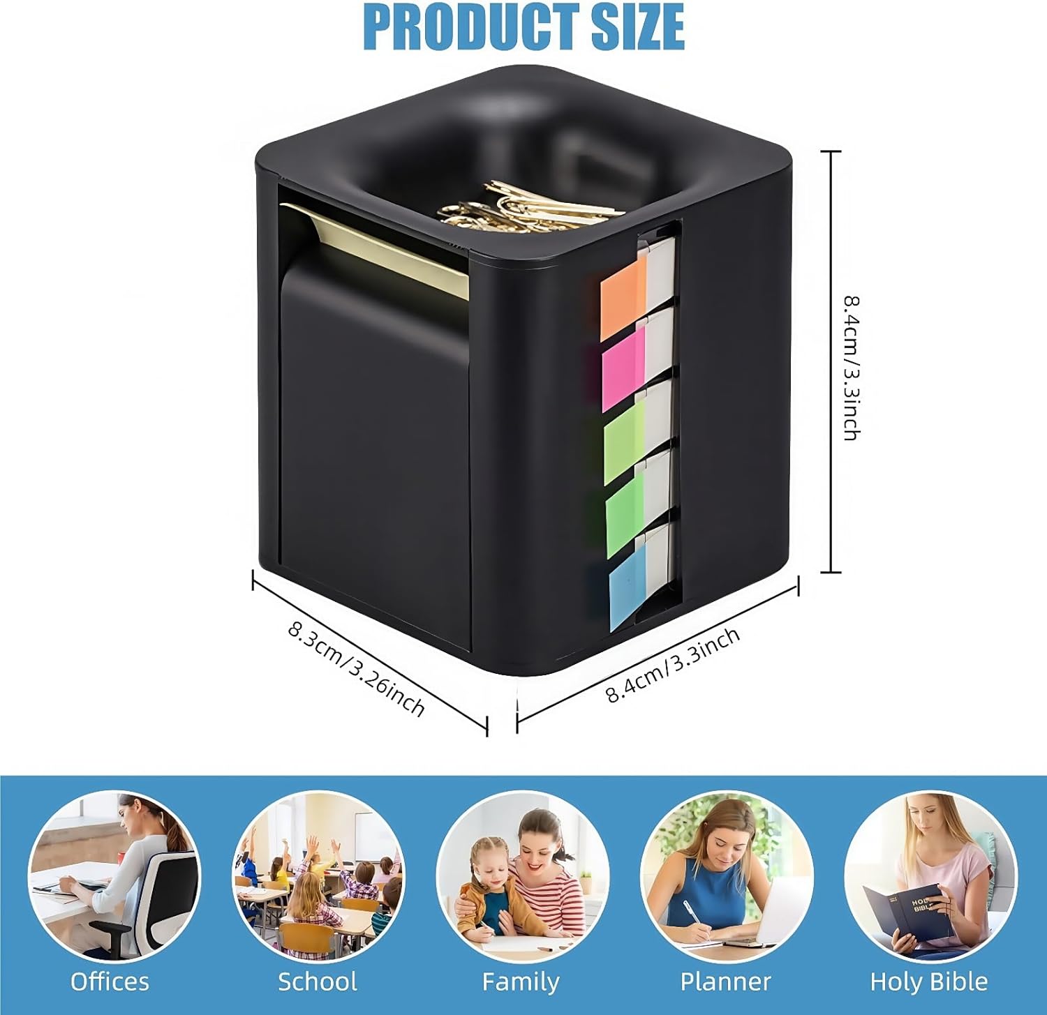 5-in-1 Sticky Note Dispenser and Holder with Pop Up Notes, Transparent Tabs, Magnetic Paper Clip Holder, Roll Sticky Notes - Multifunctional Cube Desk Organizer for Office, School & Home (Black)