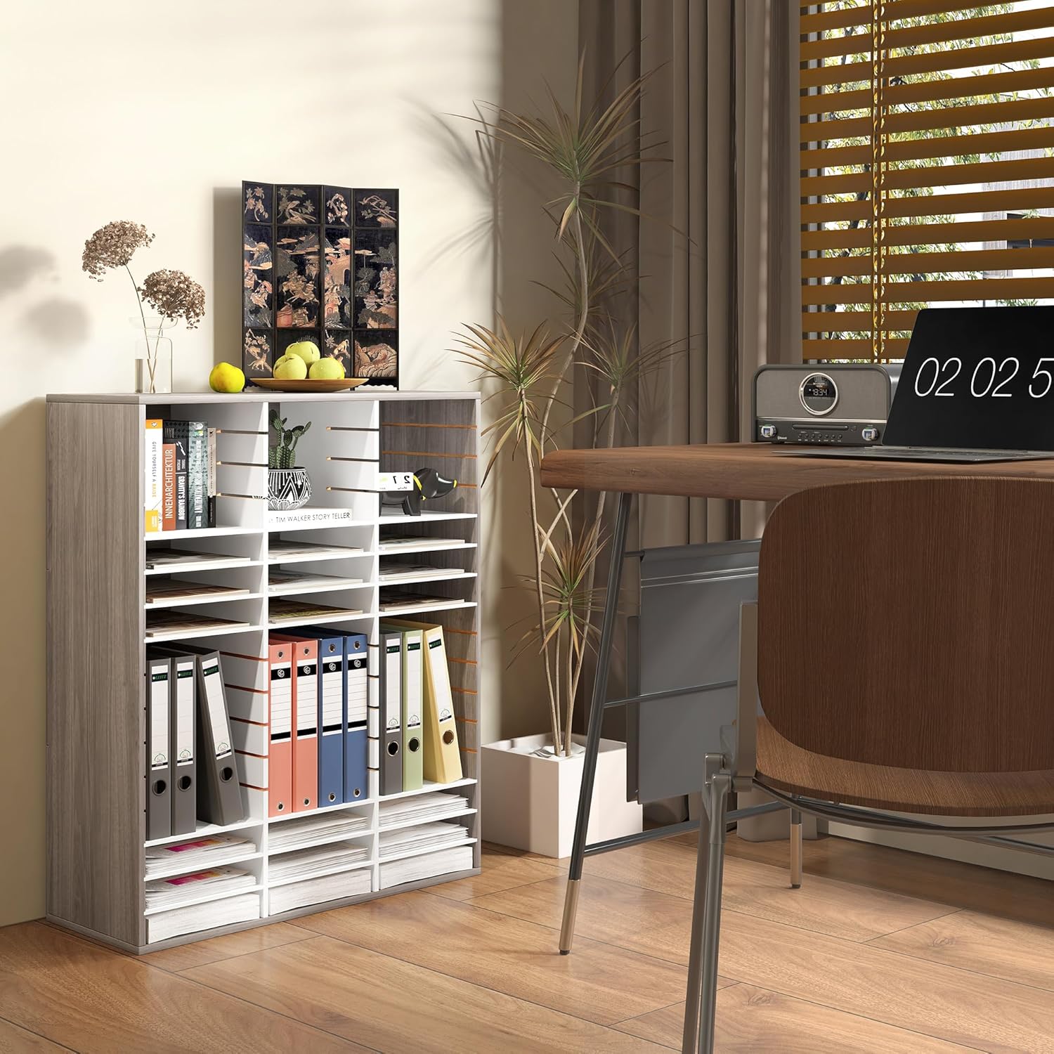 EasyPAG Mail Organizer Countertop, Wood Literature Organizer with Adjustable Shelves, Student Classroom Mailbox for School, Desktop Paper Sorter for Office Home, 36 Compartments, Retro Gray/White