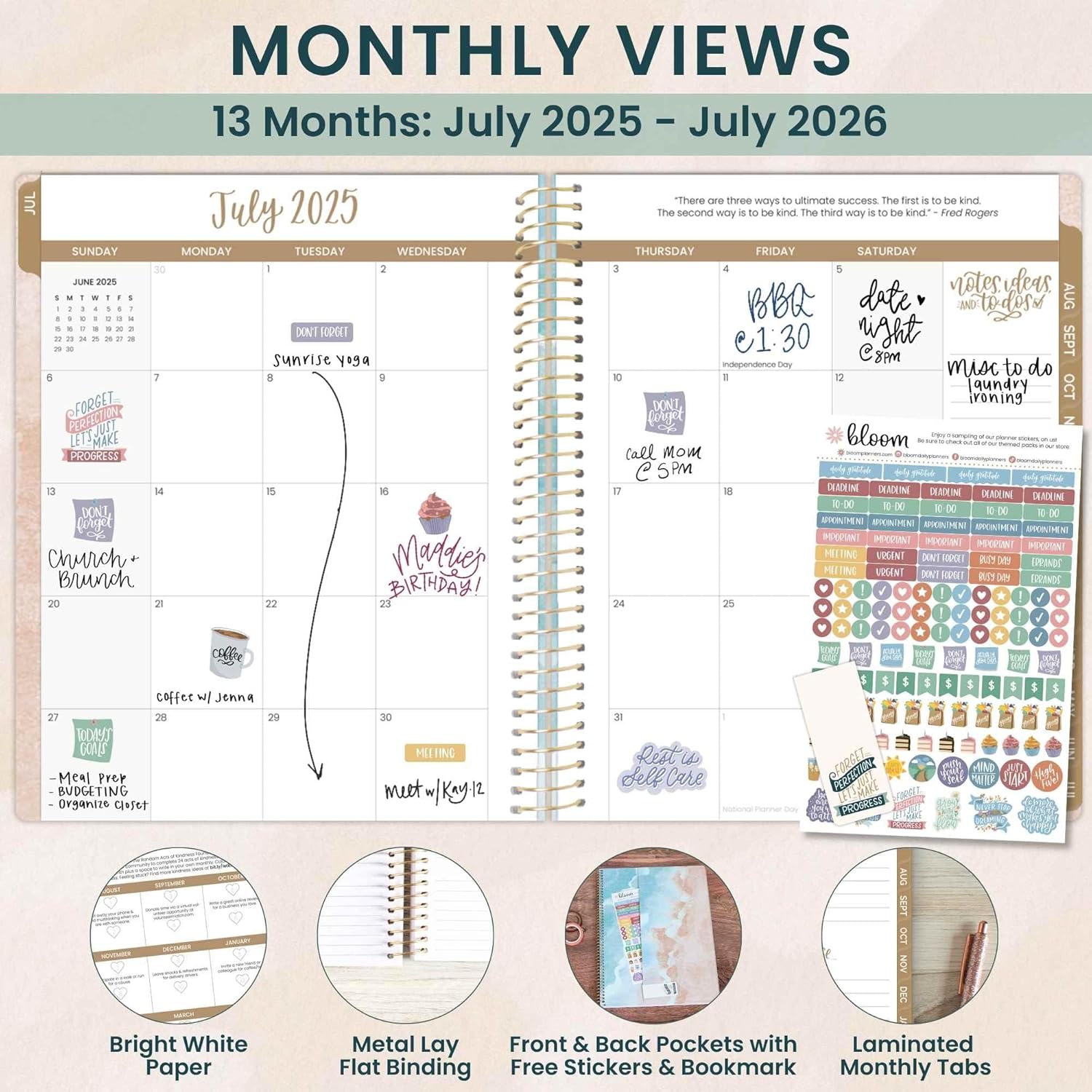 - 8.5” x 11” WITH HORIZONTAL WEEKLY LAYOUT & MONTHLY VIEWS: 2 page monthly overview spreads and spacious weekly views run Academic Year, July 2025 through July 2026. Weekly views are horizontal and include priority & habit tracking.