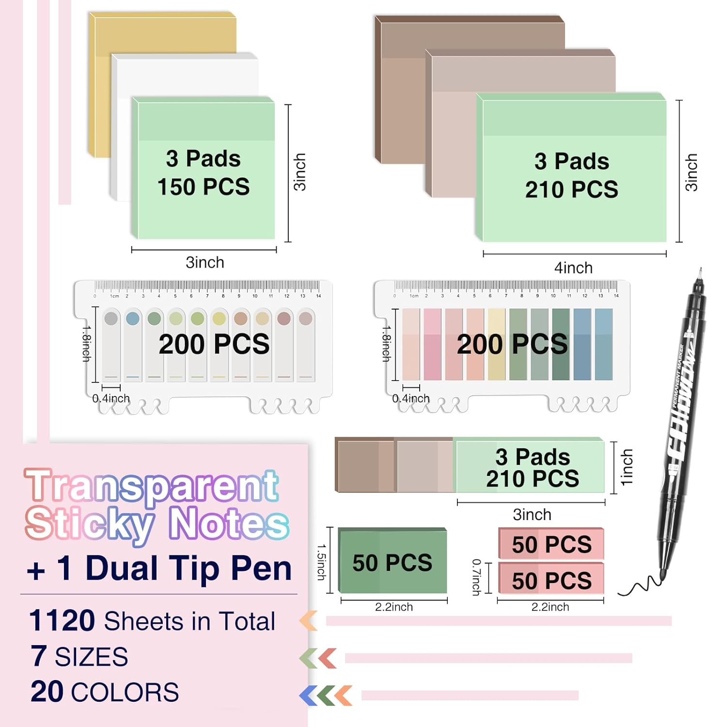 - 【Transparent Sticky Notes】Transparent sticky notes set offers great value with 4 shapes, 8 sizes, 20 colors, and 1120 sheets in pastel colors, enough supplies for a long time. Clear sticky notes meet your various note-taking needs.
