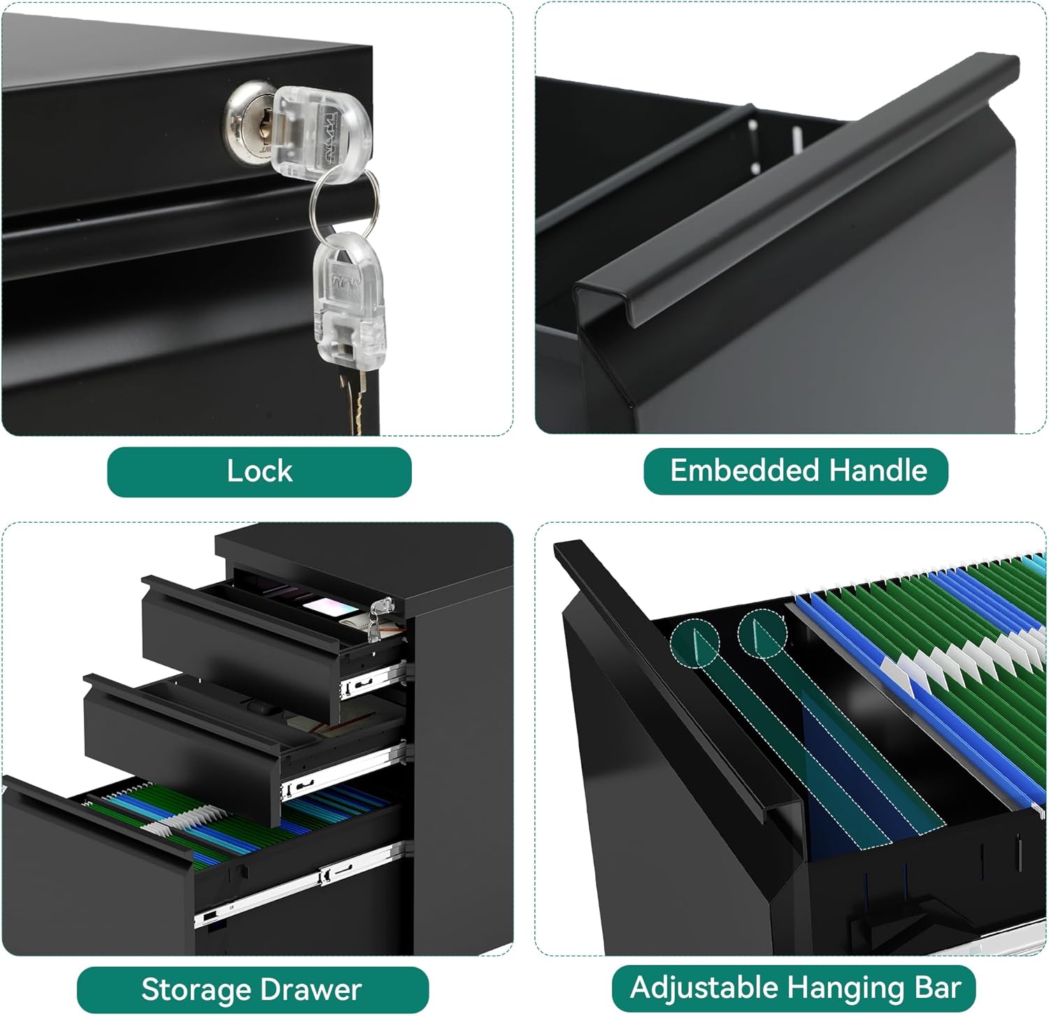 YITAHOME 3 Drawer File Cabinet with Lock, 20” Deep Office Vertical Files, Mobile Metal Filing Cabinet, Metal Vertical Filing Storage Cabinet for Letters/Legal/A4 Size,Black