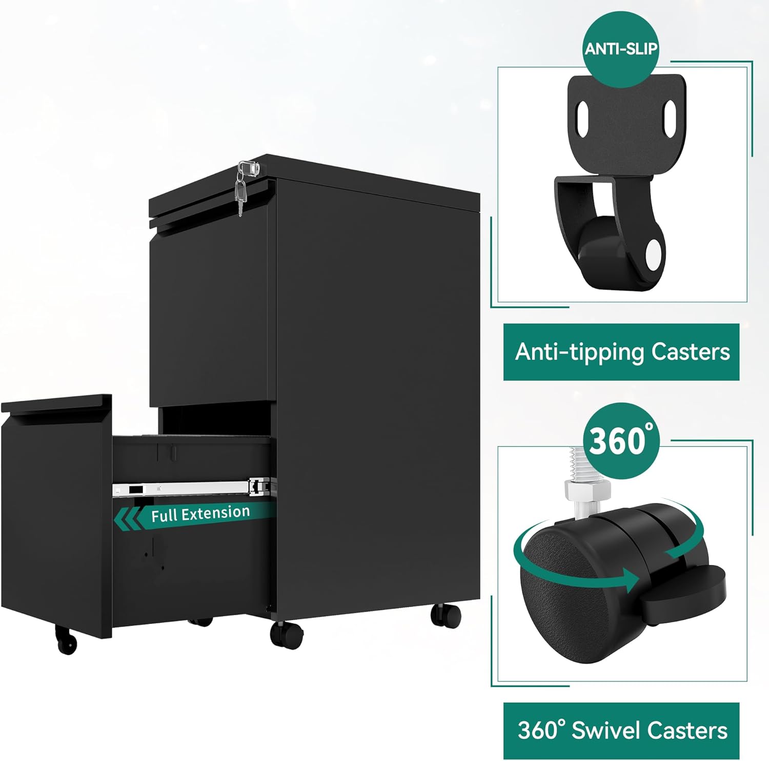 - Free-range Mobility with 5 Casters: This lockable filing cabinet has 4 x 360°swivel casters + 1x anti-tipping central caster; Easy and safe to move! 360°swivel casters provide great mobility and the central caster prevents tipping.