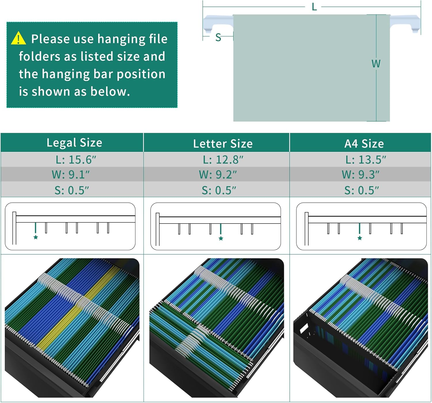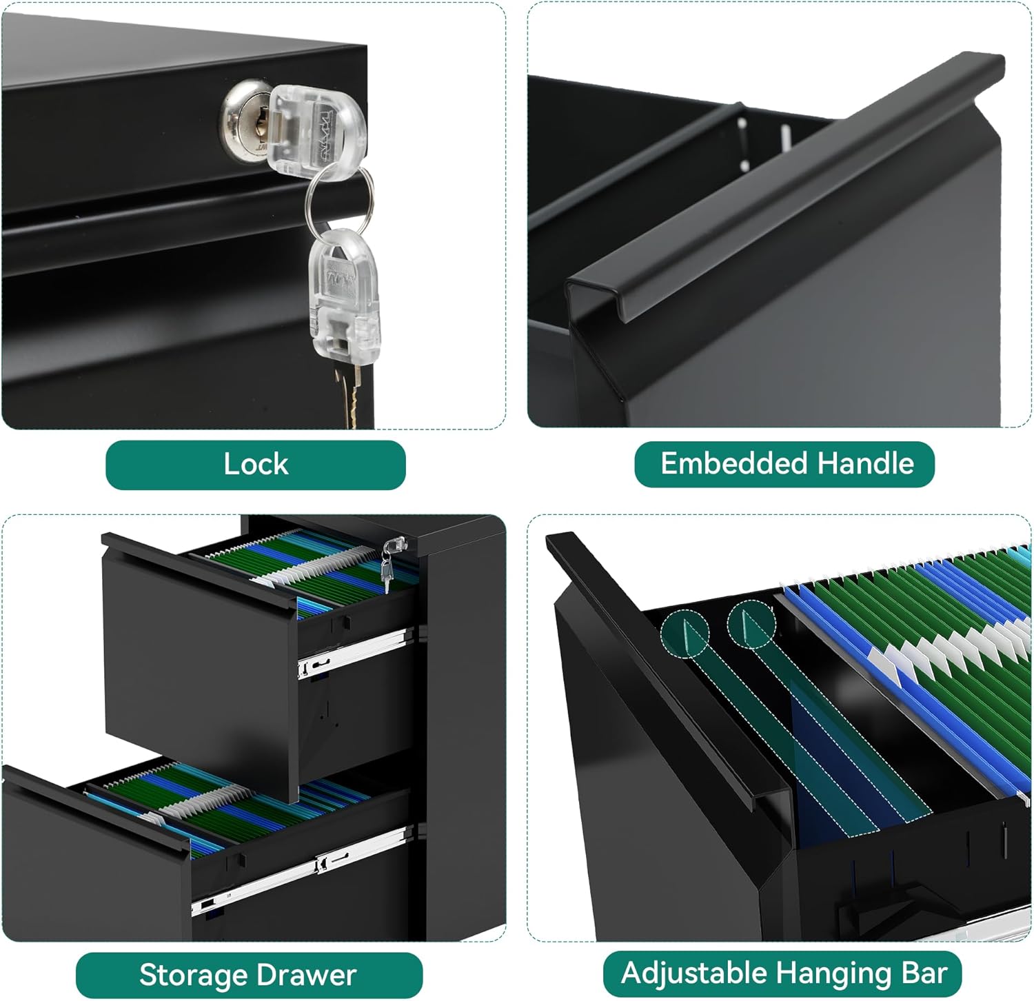 - Large storage drawer: Two drawer file cabinet provide large storage space, each drawer provides movable hanging bar, can allow letter size documents to be hung horizontally and vertically, legal and A4 size documents can only be hung vertically, not horizontally; Please carefully measure the size of your desk and documents before purchasing, so that you can better store and organize your documents.