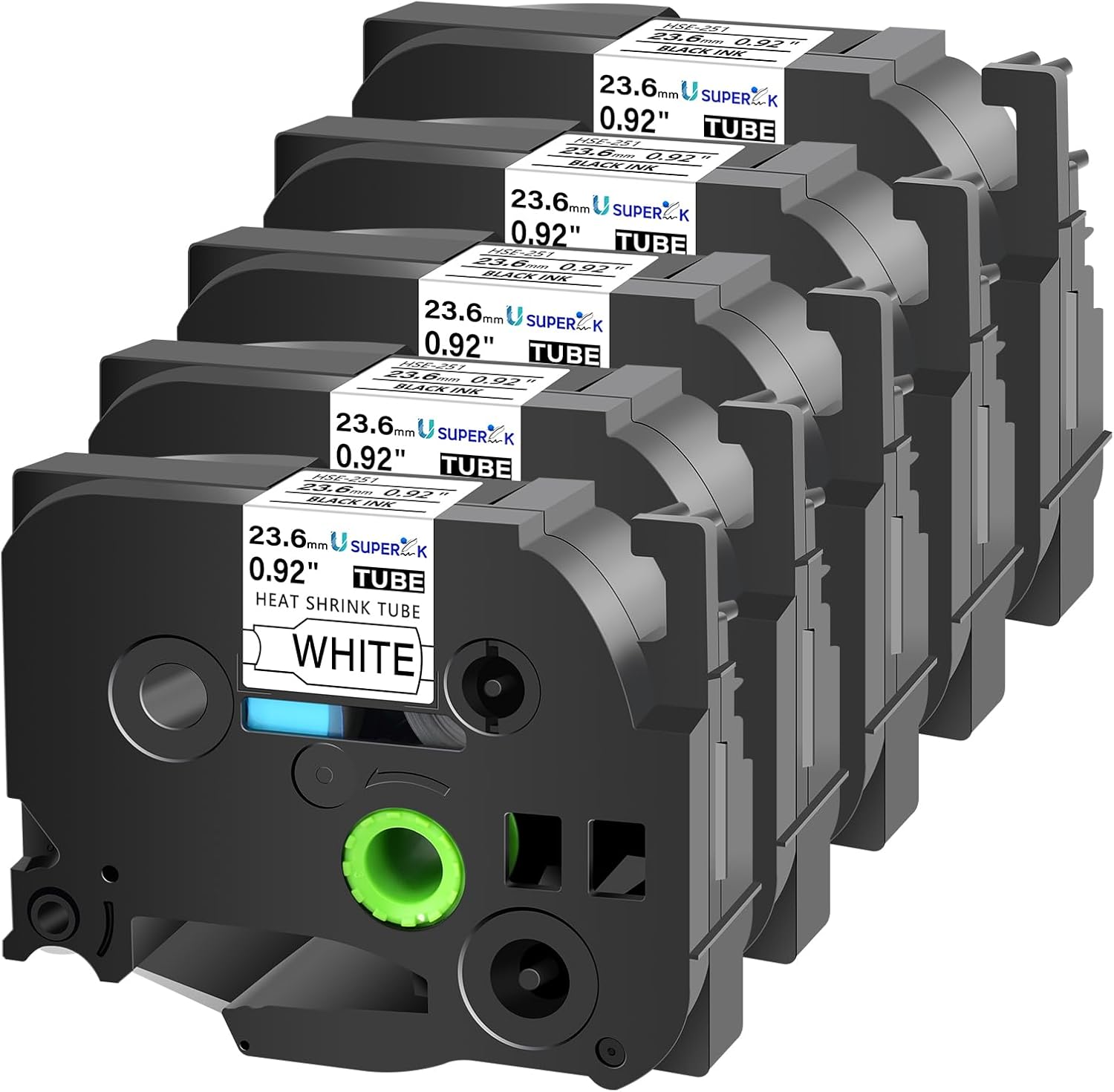 USUPERINK 5PK Compatible for Ptouch HSe-251 HSe251 HS-251 HS251 23.6mm 1 inch Black on White Heat Shrink Tube Label Tape for PT-D600 E500 E500VP E550W PT-P700 PT-P750WVP Label Maker