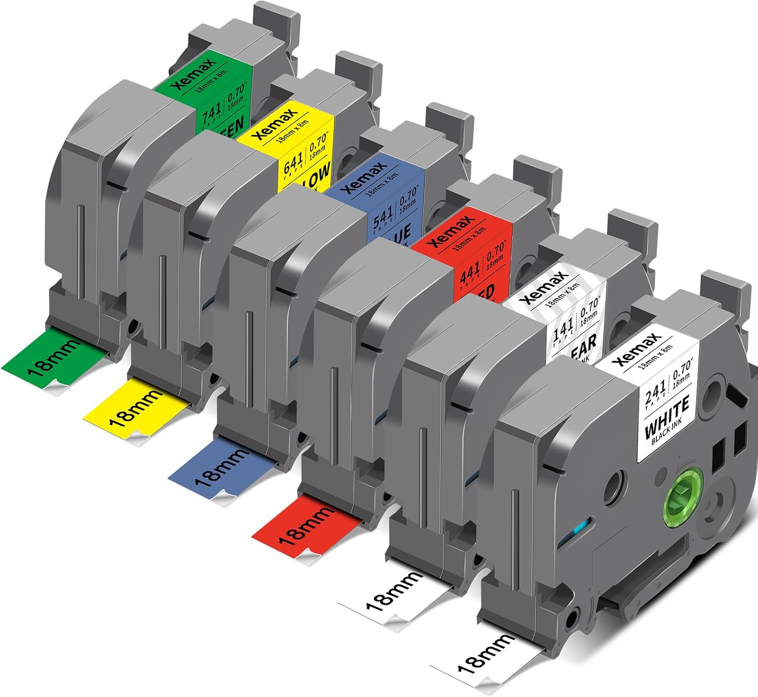 - Package Include: 6-Pack Multi-Color Tze 18mm 0.7" Label Tape Compatible for Brother Label Tape Tze-141 Tze-241 Tze-441 Tze-541 Tze-641 Tze-741 (Black on Clear/White/Red/Blue/Yellow/Green)