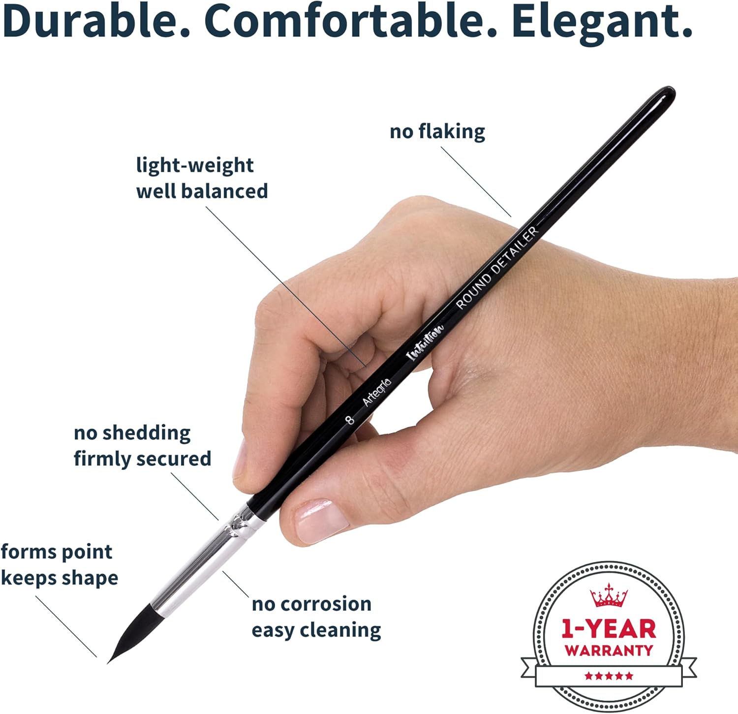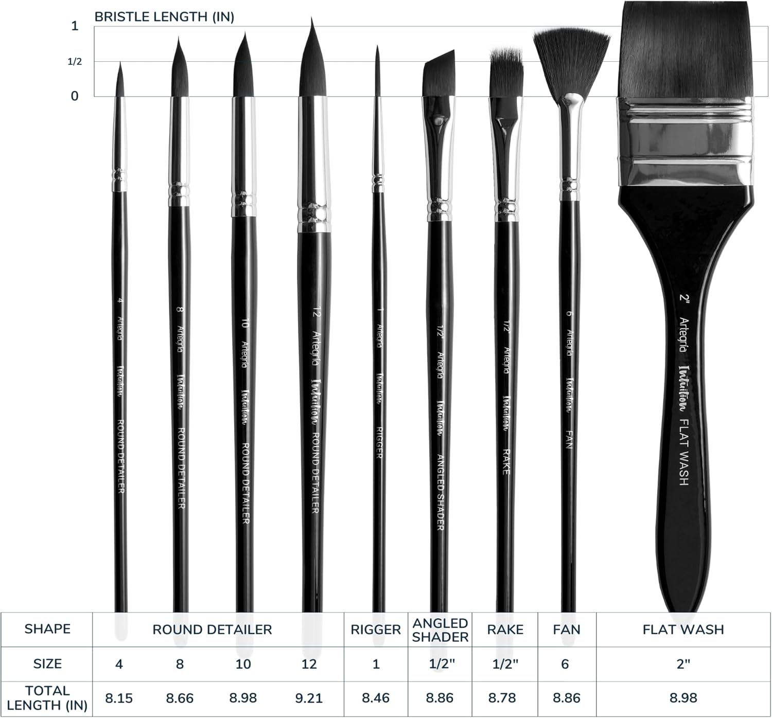 - Designed For Water-Based Paints - Wide variety of shapes and sizes for various watercolor art techniques from precise detail to large washes; Including fine tipped Round Detailers #4 #8 #10 #12, Rigger #1, Fan #6, Flat Wash 2", Angled Shader 1/2", Rake 1/2"