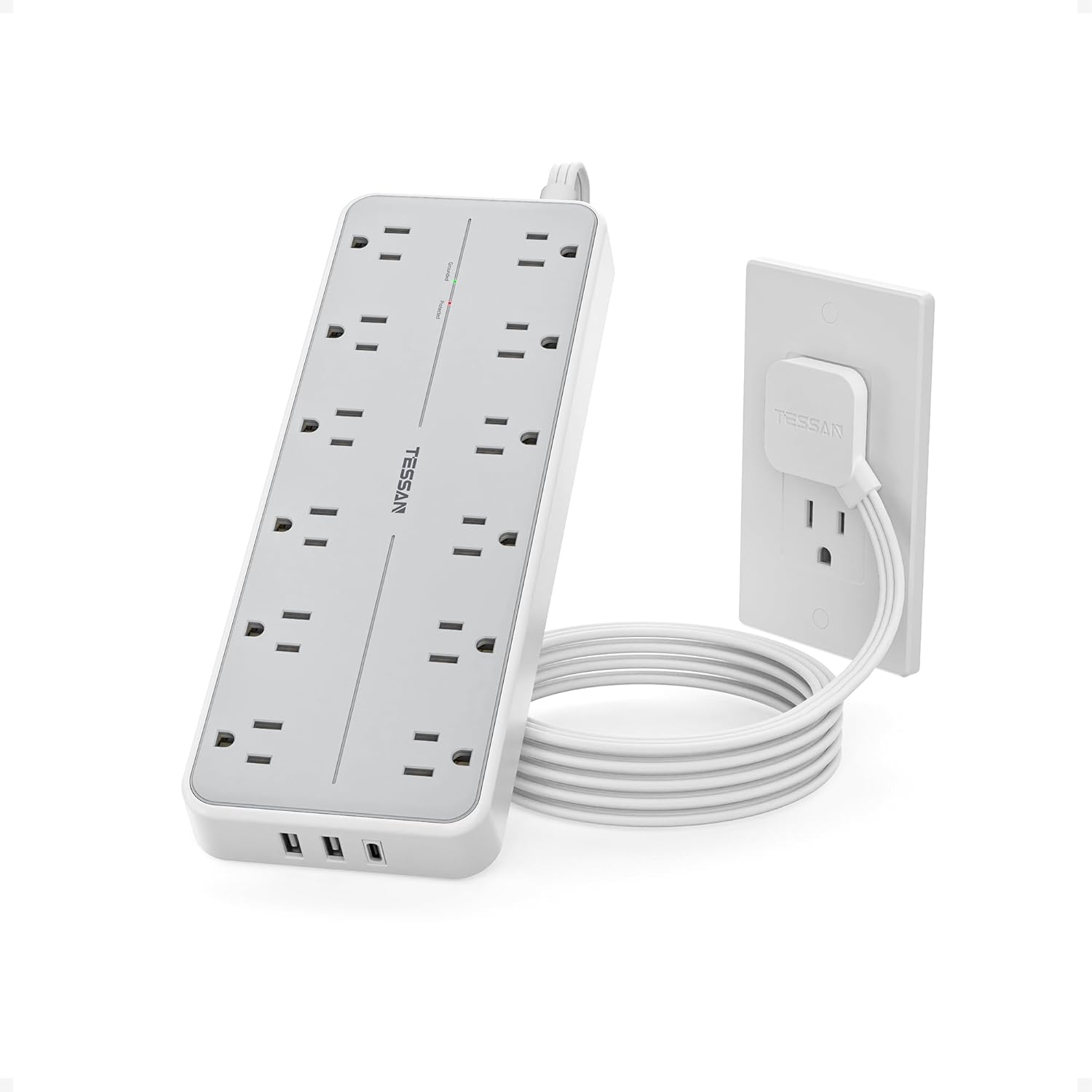Surge Protector Power Strip, TESSAN Extension Cord with Multiple Outlets, 12 AC Outlets, 3 USB Ports(1 USB C), Flat Wall Plug, 5 Ft, 1700 Joules Protection for Home Office Dorm Room Essentials