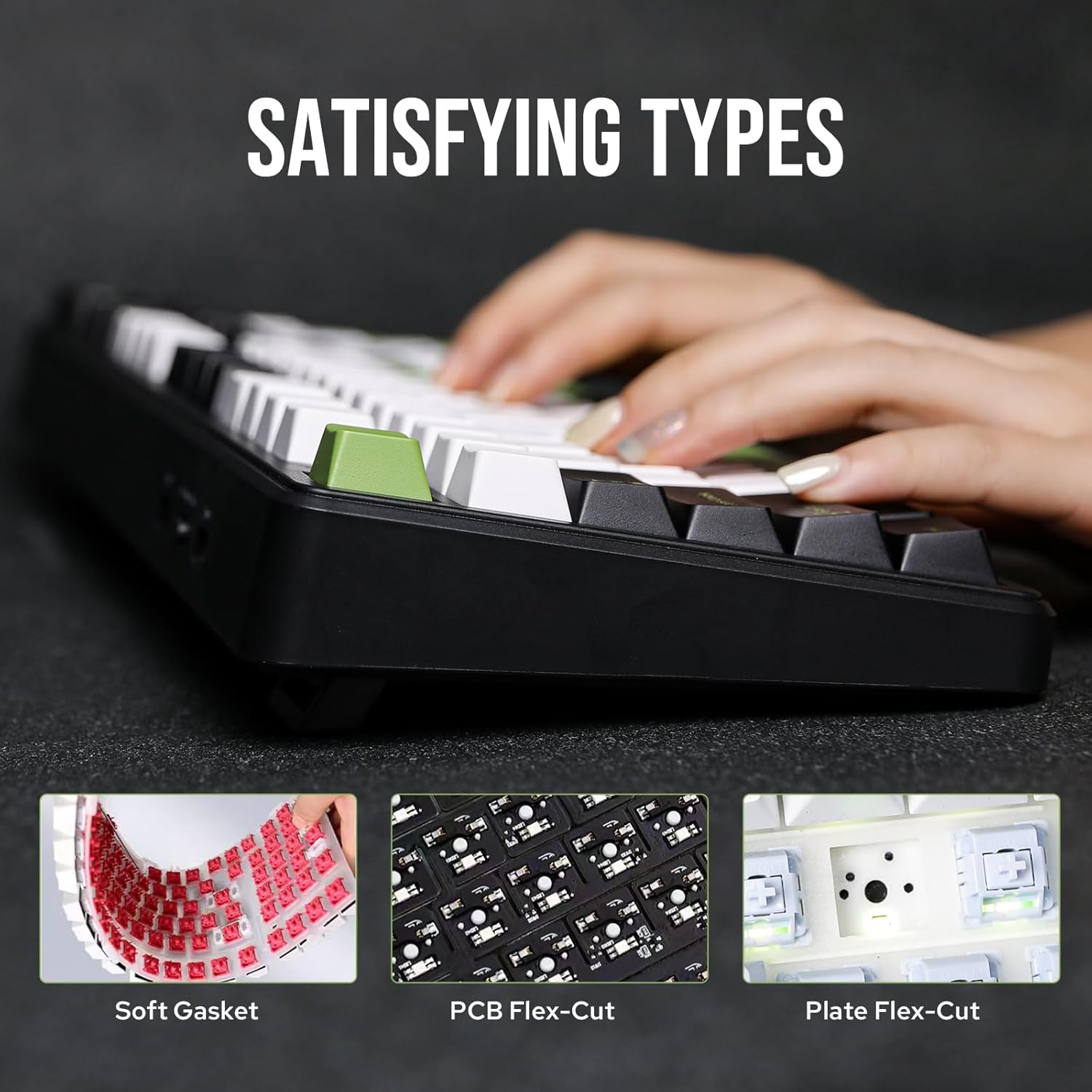 - Gasket Structure&Five Layers of Sound-Improving Materials: The F99 PRO mechanical keyboard adopts a gasket structure, extended integrated silicone pad, and PCB flex-cut to optimize elasticity and stability, providing a softer and more elastic typing experience. Equipped with 5 layers of sound-dampening materials, it enhances the acoustic effect of typing. The combination of sandwich foam, IXPE switch pad, PET sound-improving film, bottom foam, and silicone shell pad helps eliminate echo and provides stable and comfortable typing sound