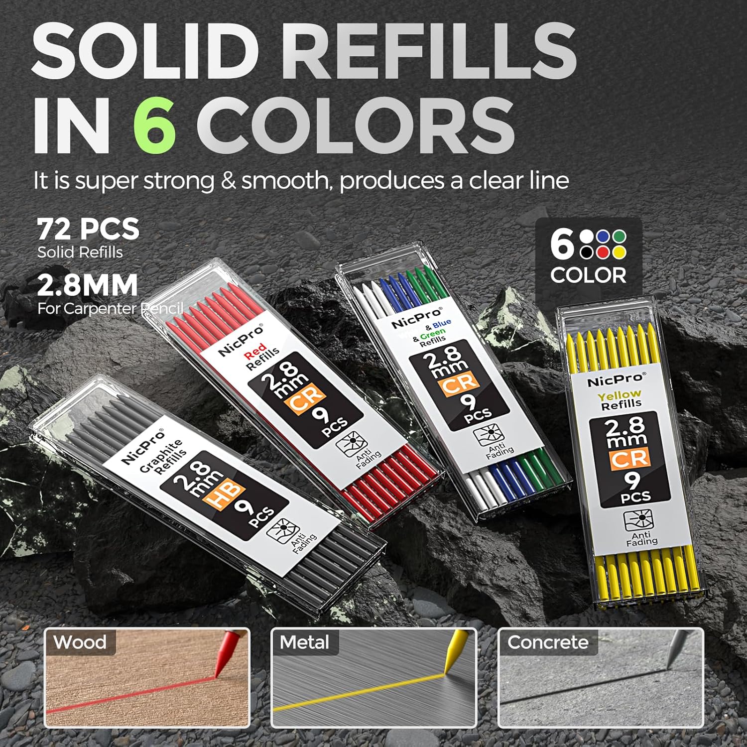 Nicpro 4 Pack CP3000 Carpenter Pencil with Sharpener, Mechanical Pencils Set with 76 Refills, Heavy Duty Construction Pencil, Carpenter Tools for Architect Marking (Red, Black, Yellow, Green)