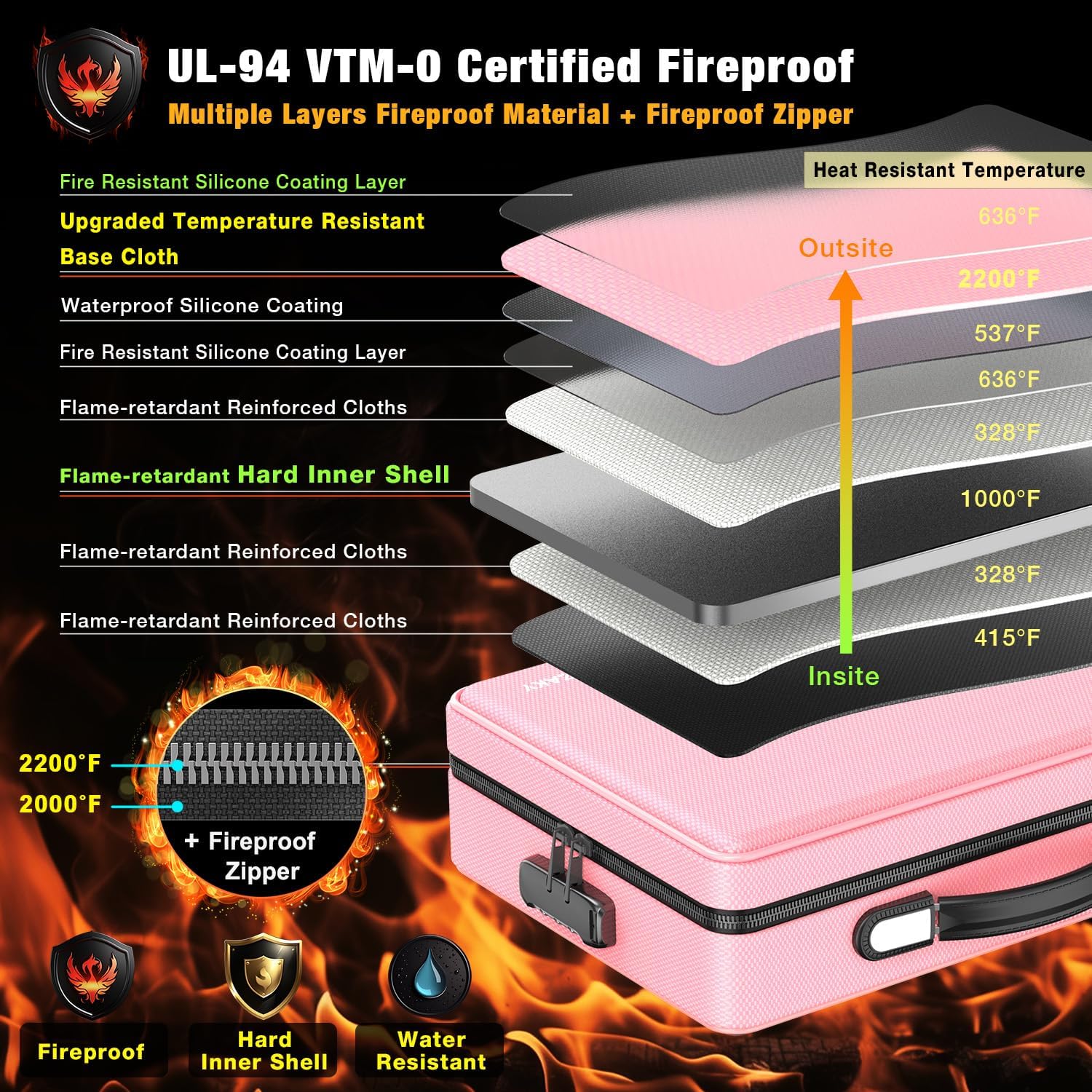 - 【Multi-Layer Fireproof & Defense】Featuring a hard inner shell and a soft exterior made of multilayer fireproof material. The introduction of a fireproof metal zipper for the first time has elevated the safety level of the fireproof box. The fireproof metal zipper is made of high-strength metal teeth and high-density fireproof base cloth, which can effectively block flames from the outside in all directions.
