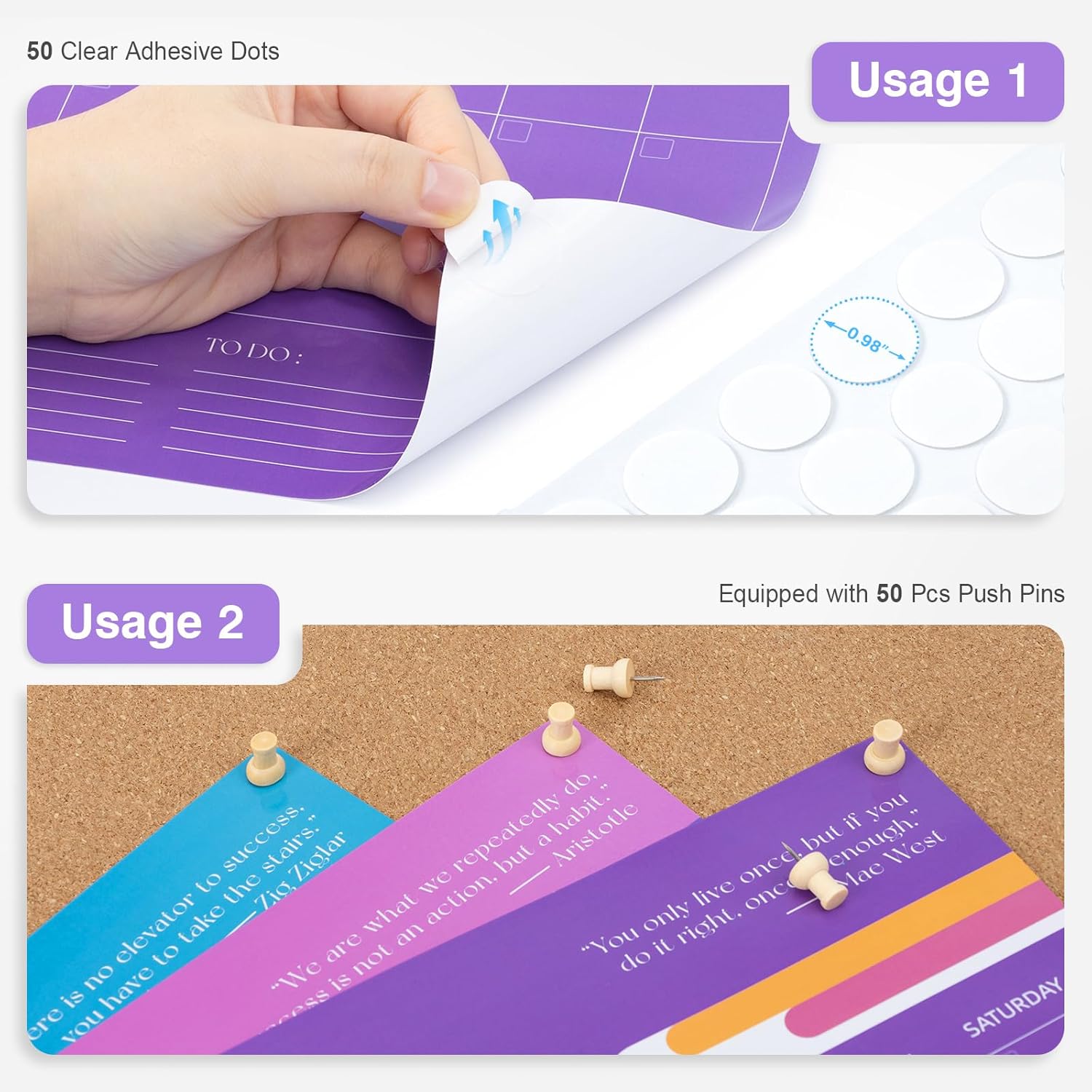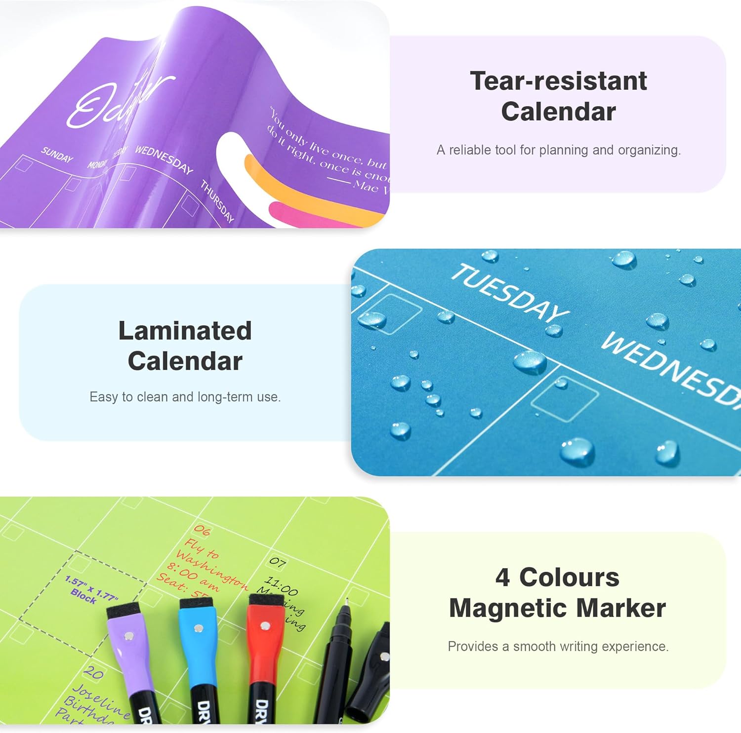 - ⨠Undated Laminated Calendar: This waterproof wall calendar comes with a mini eraser, four dry-erase markers, 50 push pins, and 50 transparent round stickers. The undated monthly calendar can be started at any time, making it perfect for long-term use.