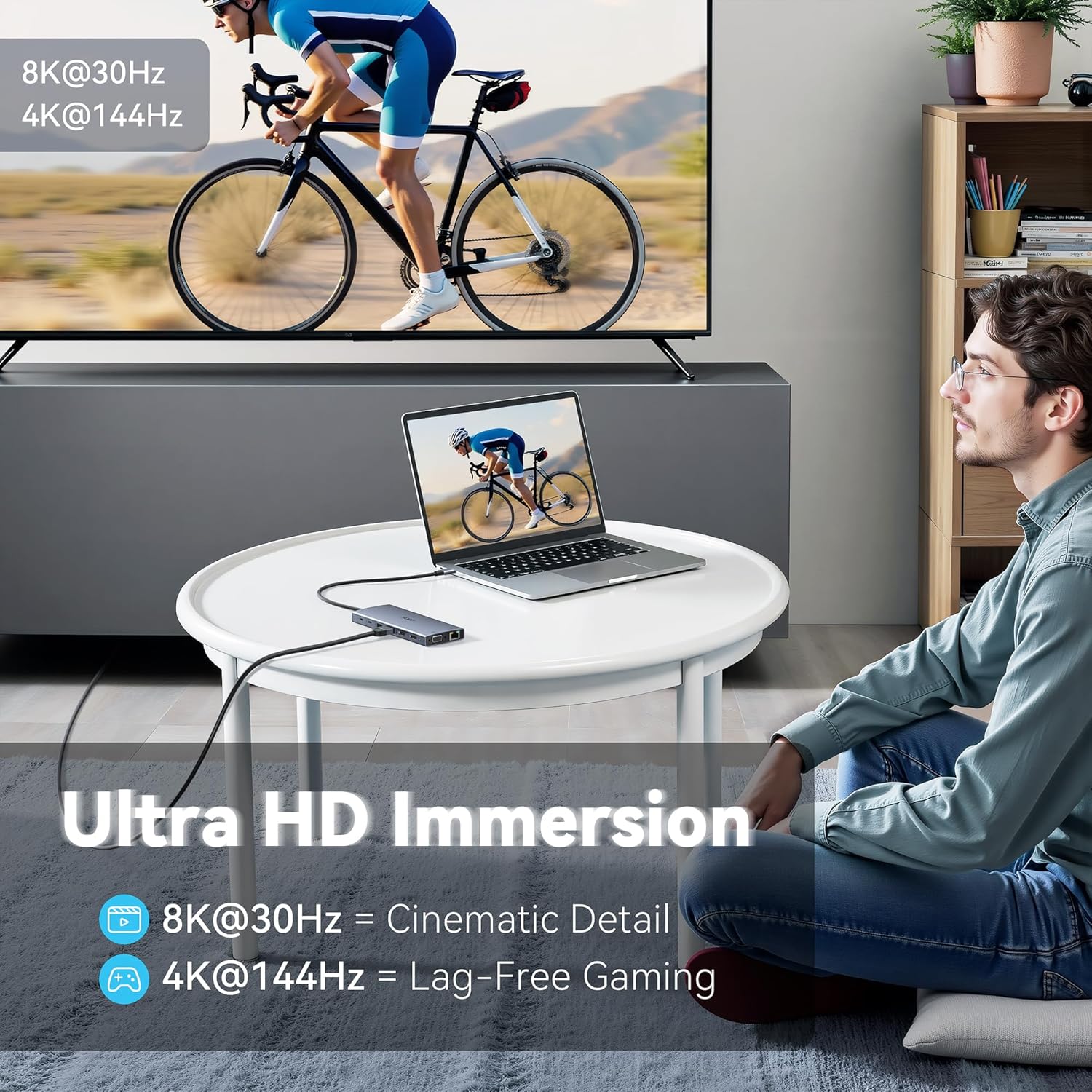 - Laptop Docking Station 4K Display Adapter: The 15 in 1 USB C Hub with 4K Video Output Ports: 2 HDMI+DP+VGA. For Single Display, DisplayPort can reach 8K@30Hz or 4K@144Hz; For Dual HDMI Display and Triple Display(2HDMI+DP), Can Output Up to 4K Dual/Triple Display Videos(For Laptop with DP 1.4 DSC); For Quadruple Display, Dual HDMI, DP, and VGA all are 1080@60Hz. Please Make Sure your Laptop Specification Support DP1.4 Signal Output. If the VGA Port is Connected, It Will Affect the Resolution of All Displays Up to 1080P only.ćPlease Note: For DP1.2, When Expanding Three Monitors in MST Mode,the Resolution of One of the Monitors Will be Lower Than 1080P@60Hzć