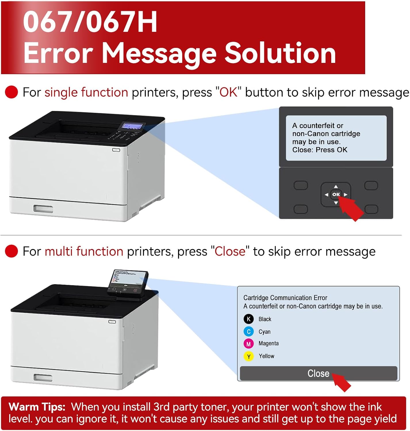 - Package Contents: 1 x 067 Black toner, 1 x 067 Cyan toner, 1 x 067 Magenta toner, 1 x 067 Yellow toner , 1 x User Guide, 4 Pack Compatible for Canon 067 067H toner cartridge set