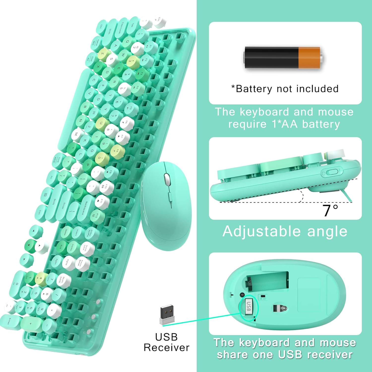 Colorful Wireless Computer Keyboard and Mouse Combo with Round Typewriter Keycaps, Retro Design, Power Switch, Ergonomic Design, 2.4GHz Wireless for Windows, Mac, PC(Green-Colorful)