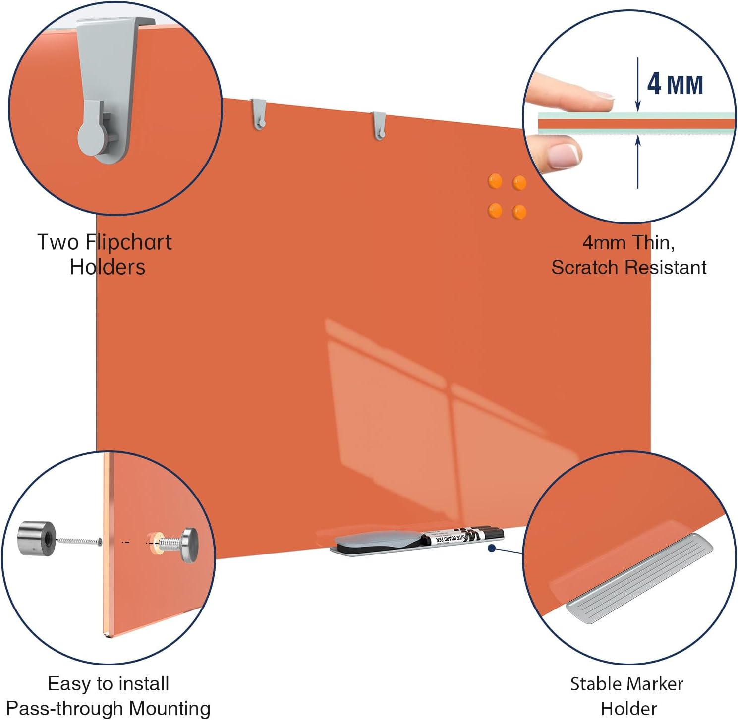 TSJ OFFICE Glass Dry-Erase Board - 36 x 24 Inches Wall Mounted Magnetic Whiteboard, Large Frameless Glass White Board for Office, Home & School, Orange