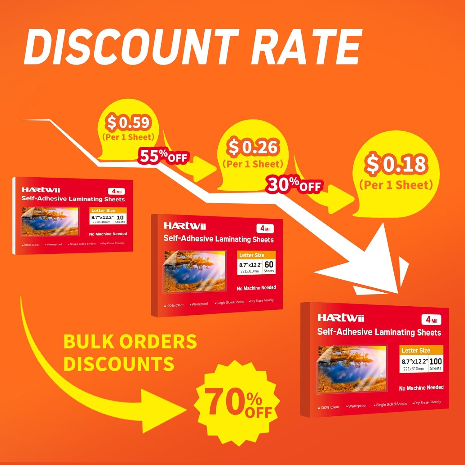 - UNIVERSAL DIMENSIONS:Hartwii Self-adhesive laminating sheets 8.7x12.2 inches ,4mil thickness ,value bulk package ,100 pack of self sealing laminating sheets ,it suitable for laminating 8.5x11 inches ,or smaller photos ,cards,labels,and stickers ,Single Side laminating film ,you can use two single-sided self laminating sheets us lamiate both front and back of a letter size paper