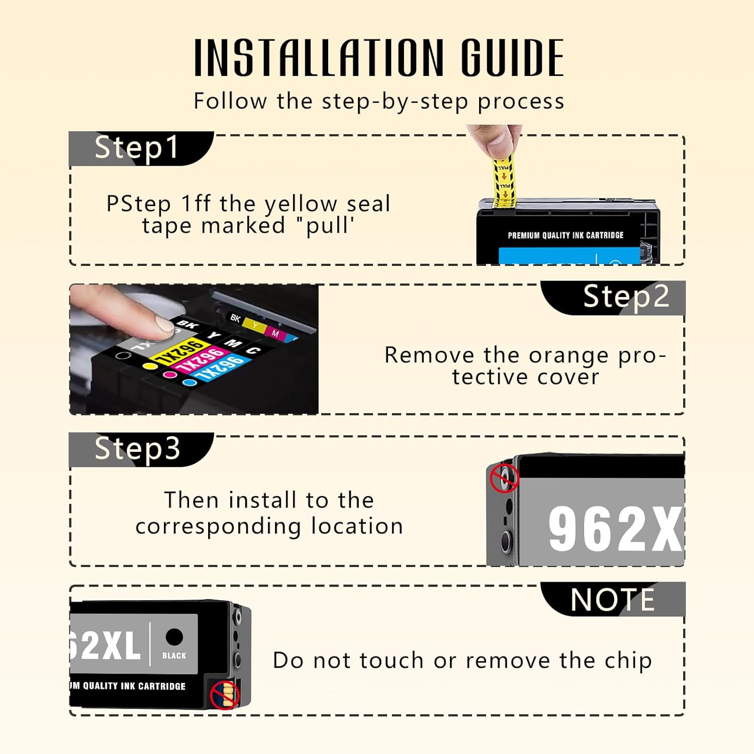 - --For hp 962xl ink cartridges combo pack / 962xl ink cartridges combo pack with latest upgraded chip --note: for hp 962xl ink cartridges combo pack latest upgrade ink cartridges100% Compatible With Printers Which Actived For HP+ service, and Compatible With *e Series Printers.Before placing an order, please ensure that your printer is compatible for hp 962XL or 962 ink cartridge to prevent any inconvenience during the printing process