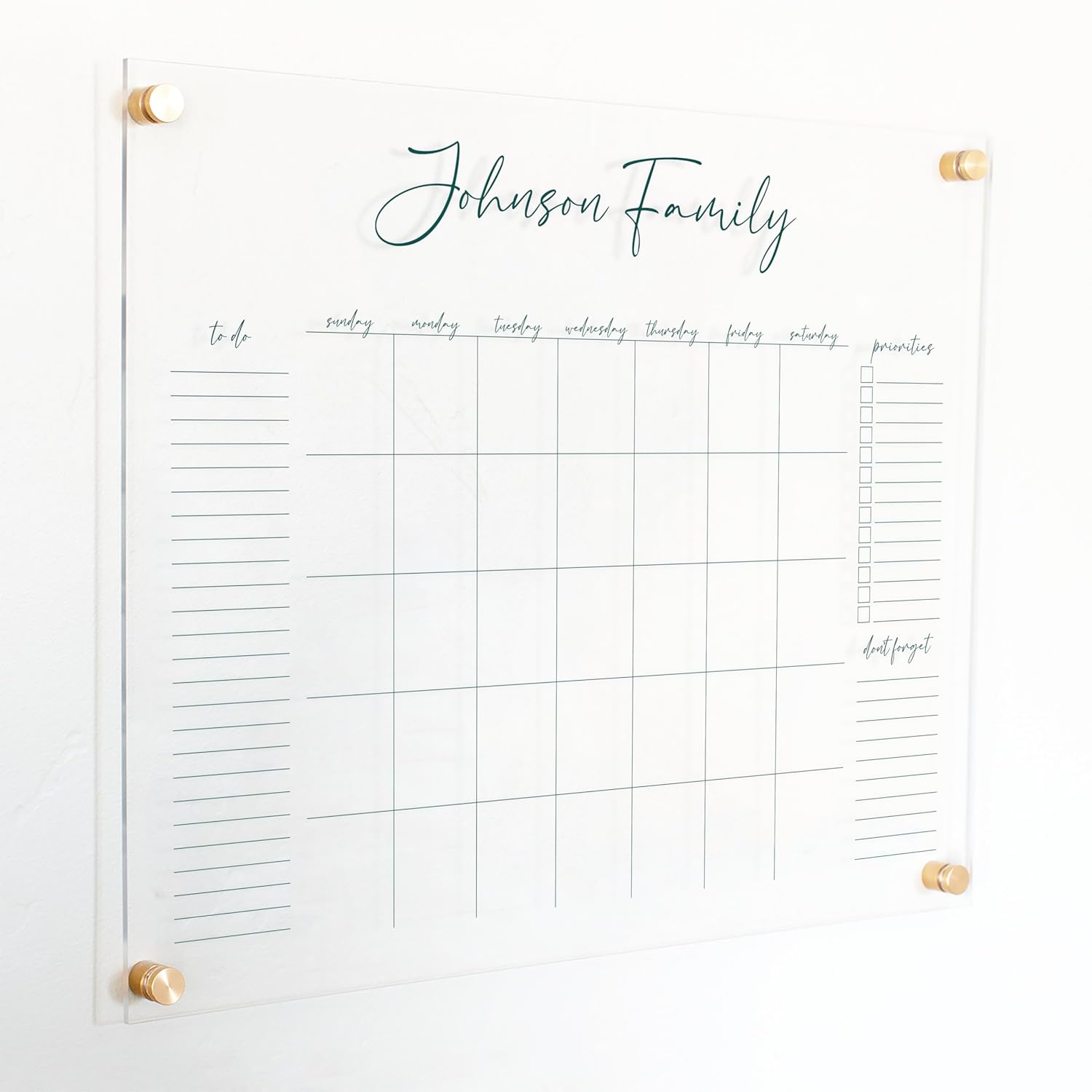 Personalized Clear Acrylic Calendar for Wall, Calendar Whiteboard for Wall, Dry Erase Wall Calendar, Wall Calendar Organizer System for Home (Cursive, Jade, 23"W x18.5"H)