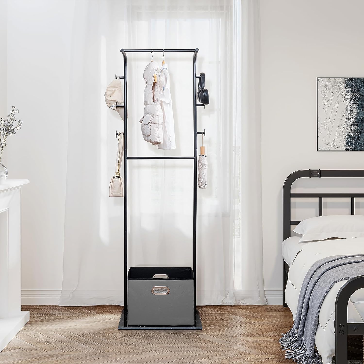 - Larger Storage Space : Designed with two long crossbars and 6 hooks, this free standing coat rack provides plenty of room for hanging items. It also includes a spacious, removable leather storage basket (15.75 x 11.42 x 11.42 inches), offering versatile organization options that can be used independently.