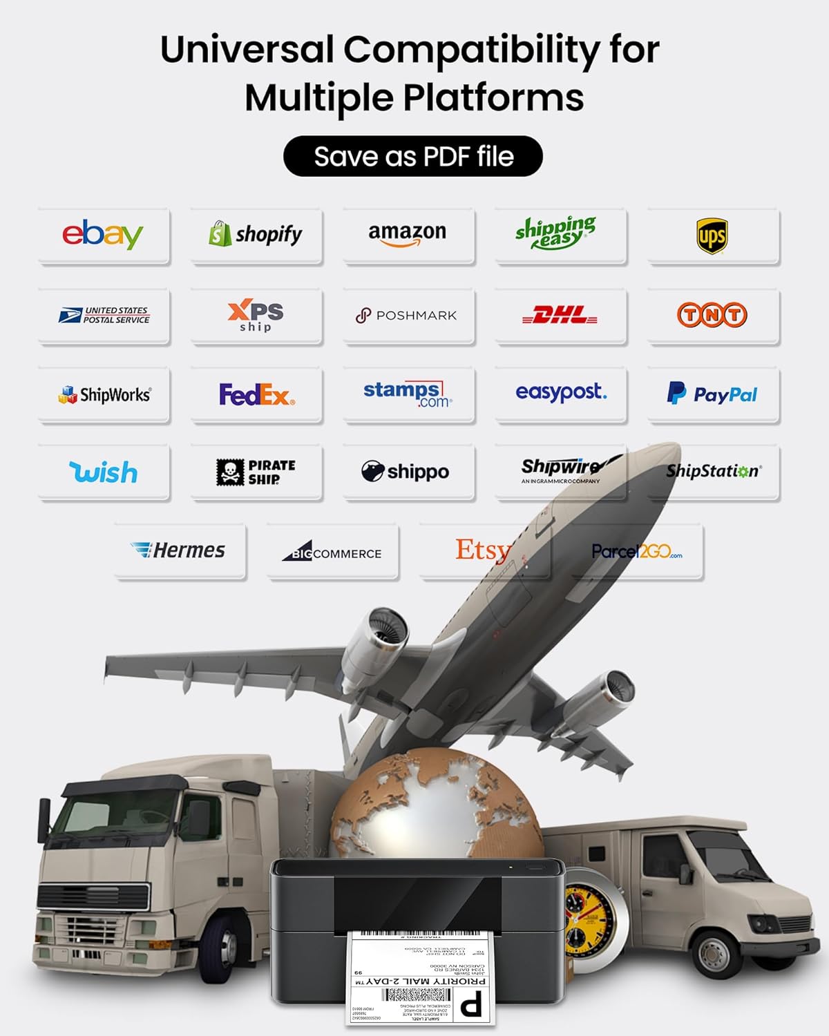 - Wide Application: This label printer for small business works with virtually all platforms like Amazon, Ebay, Shopify, USPS, UPS, Esty, PayPal, DHL, FedEx, etc. Besides, our desktop usps label printers prints labels from 1 to 4.6 inches wide for text, images, barcodes, QR codes, forms, holiday cards, and thank you cards. It has lots of icons and templates for both commercial and home use, boosting your efficiency. It also makes a thoughtful gift for friends and family.