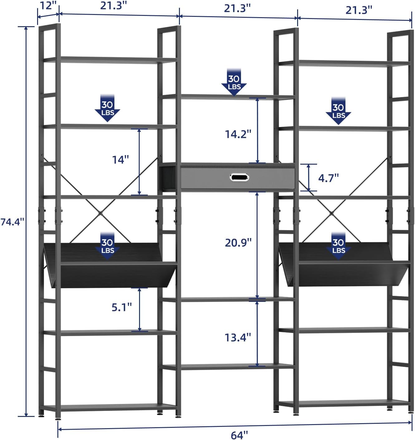 - ăTriple Wide Multifunctional Bookshelfă Featuring 14 open shelves, 2 V-shaped shelves and 1 storage drawer, this bookshelf provides ample space to store books, photo albums, alarm clocks, potted plants, and various decorations; It serves as both a functional storage unit and a stylish display for your beloved collections; The minimalist and elegant design complements a variety of home decor styles, making it a versatile addition to any study room, bedroom, living room, dining room, or office; Dimensions: 64''*12''*74.4''(L*W*H)
