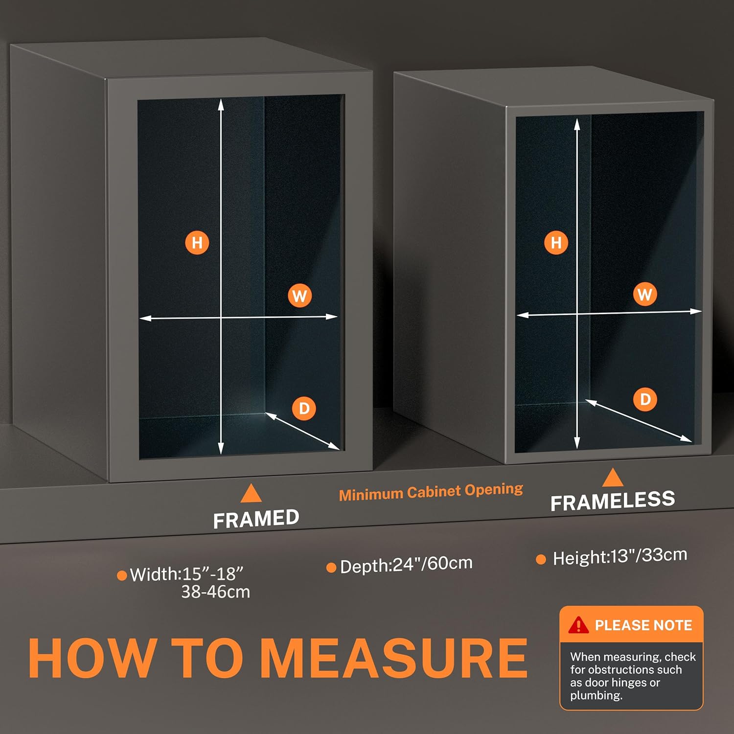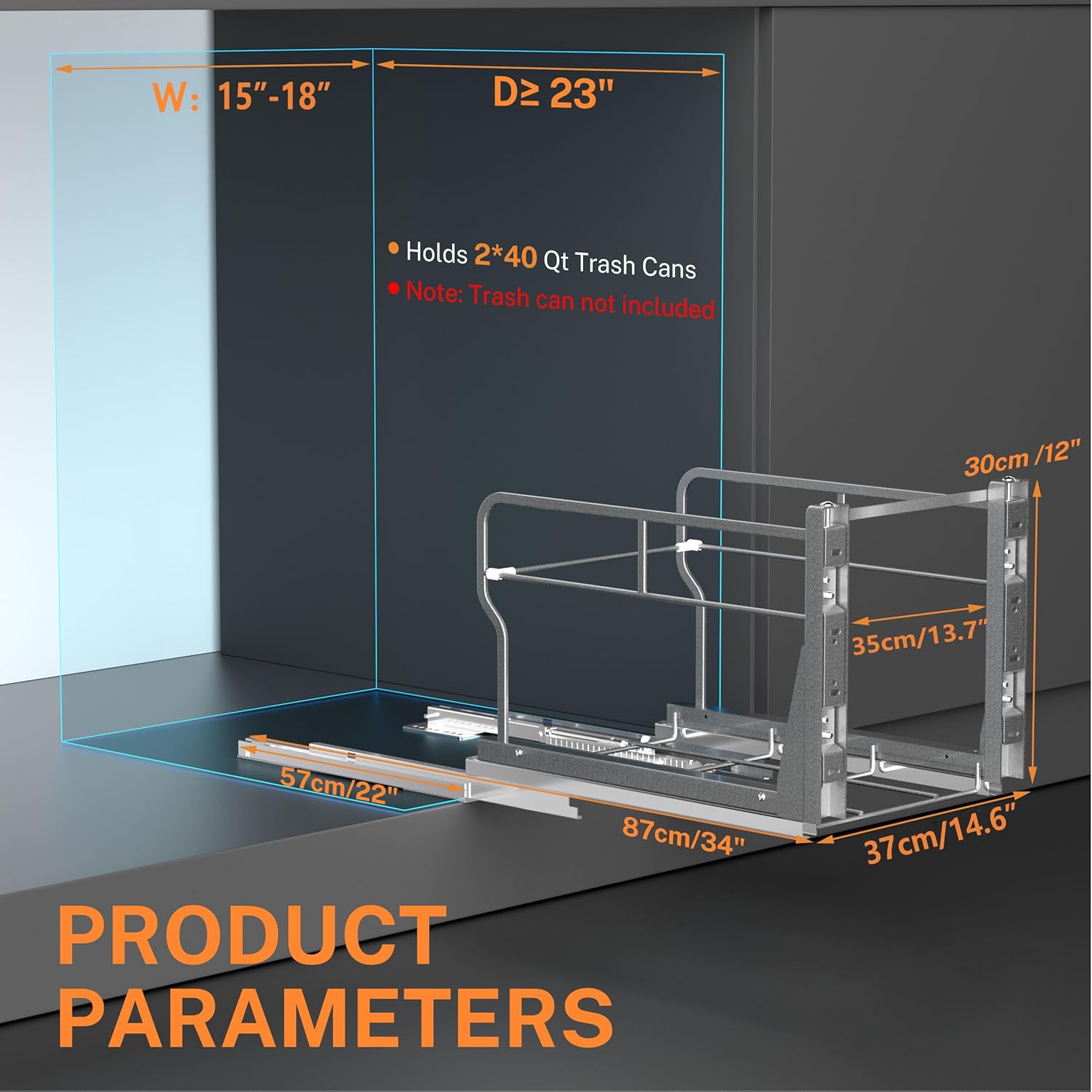 - Cabinet Requirements: Cabinet trash can pull out kit: 14.6"W x 22.2"D x 12"H; Minimum Cabinet Dimensions Required:15"-18"Wx 24"Dx 13"H. Note:The height of the trash can slider for kitchen cabinet sliding rail frame of the cabinet door should be measured according to the height of the buyer's trash can.The door mounting kit is mounted to the front of the slide frame on both sides and requires a separate tool to remove.