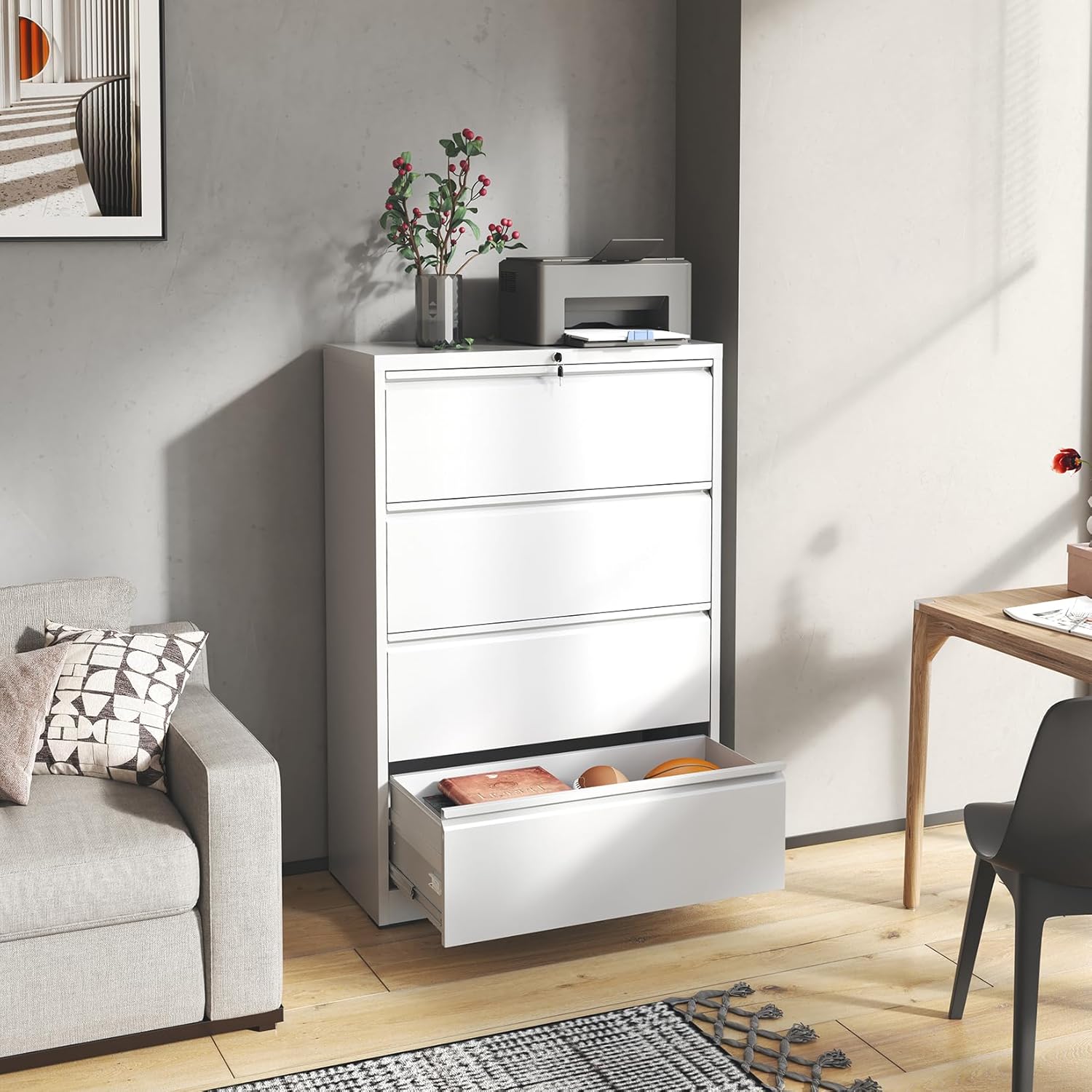 4 Drawer Lateral File Cabinet with Lock, Metal Lateral Filing Cabinet for Home Office, Steel Wide Horizontal Filing Cabinets for Letter/Legal/A4/F4 Hanging Files (White)