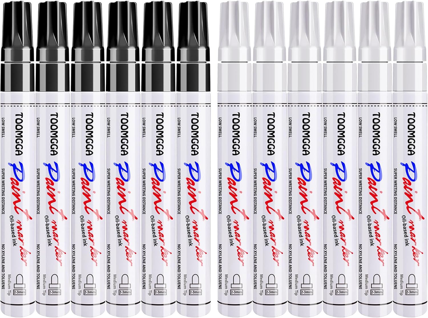 White and Black Permanent Markers Paint Pens - 12 Pack Oil Based Paint Markers, Medium Tip, Quick Drying Pens for Wood, Metal, Rock Painting, Mugs, Canvas, Clothes, Plastic Marking