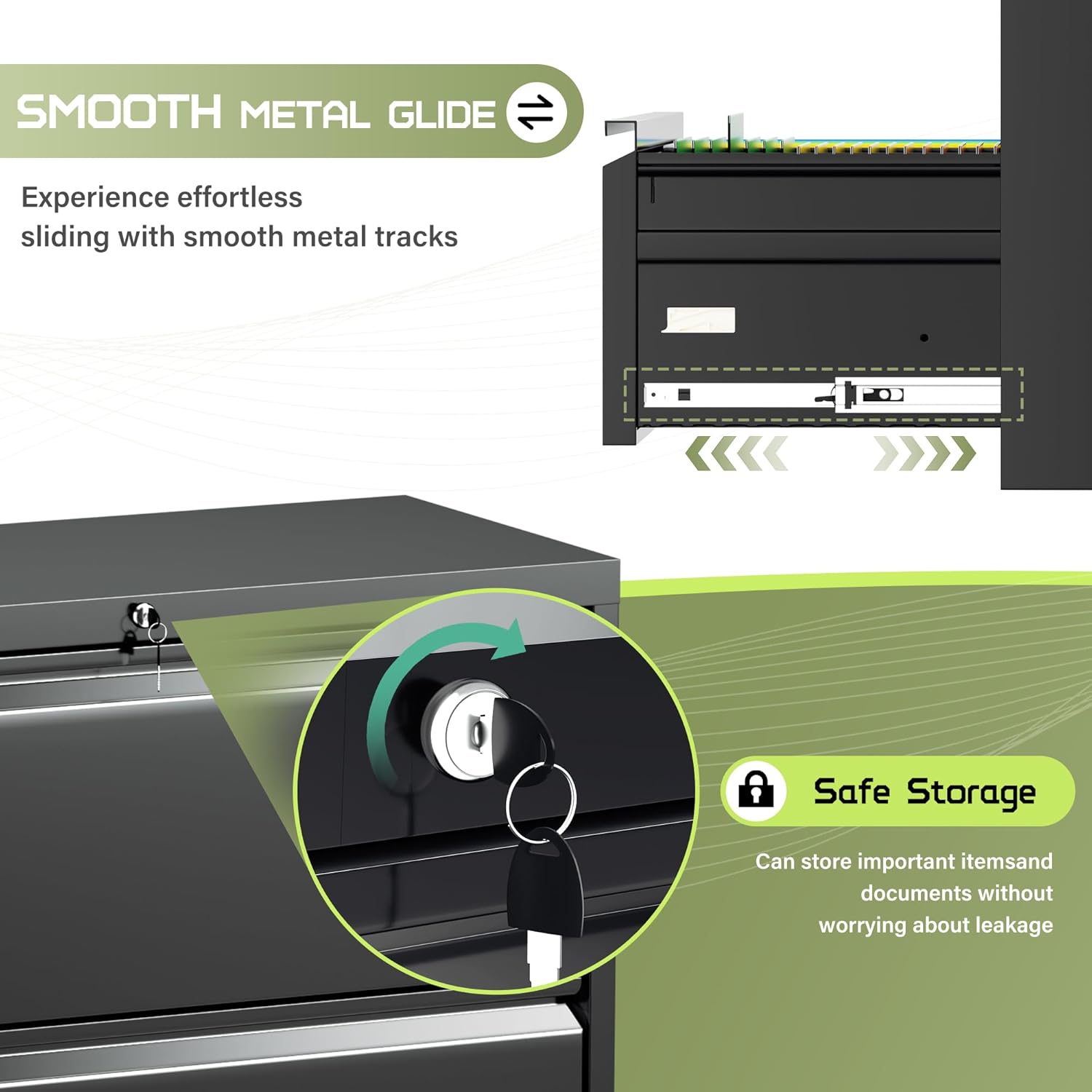 - ăUnique designăLateral file cabinet is fully suspended drawer system with ball bearings makes the switching operation easy and noiseless, which it friendly for others to work with and always keeps a quiet environment. Non-mar padded base prevent from sliding and scratching floors.